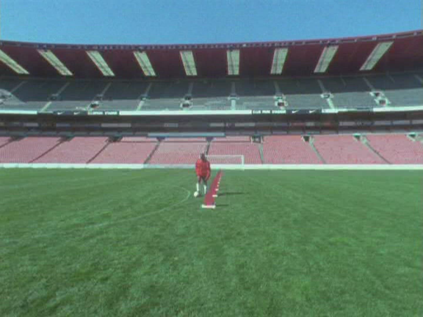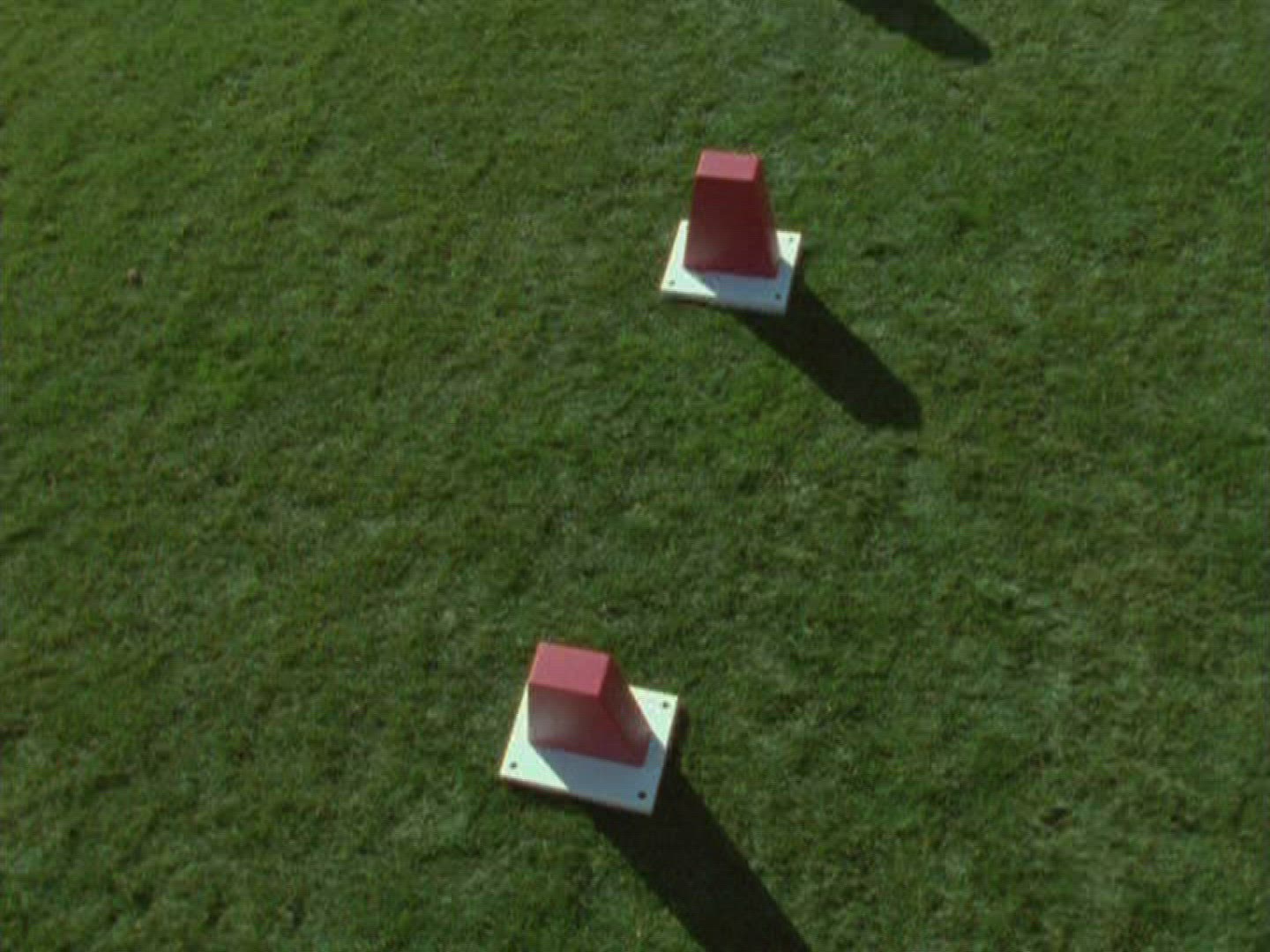 > High angle shot of a soccer player quickly dribbling the ball between beacons