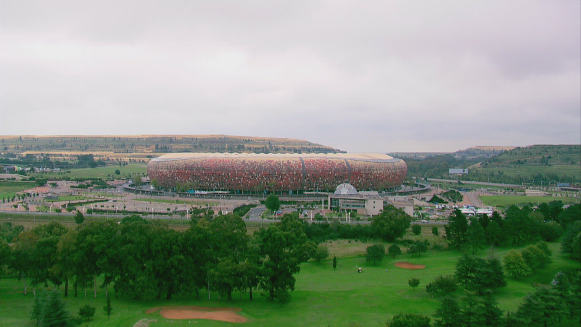 Aerial shot of FNB Stadium (Soccer City) with Johannesburg skyline