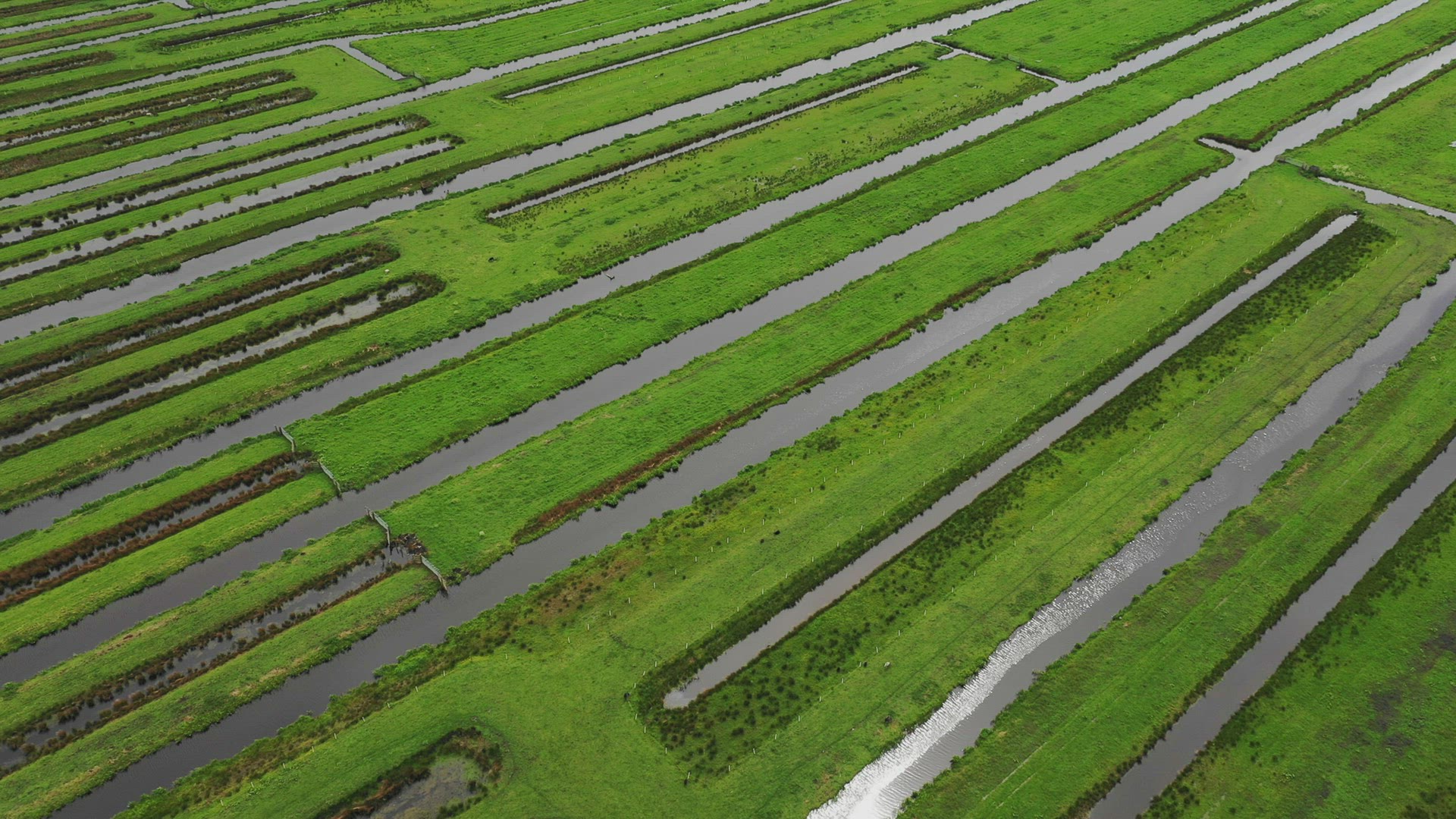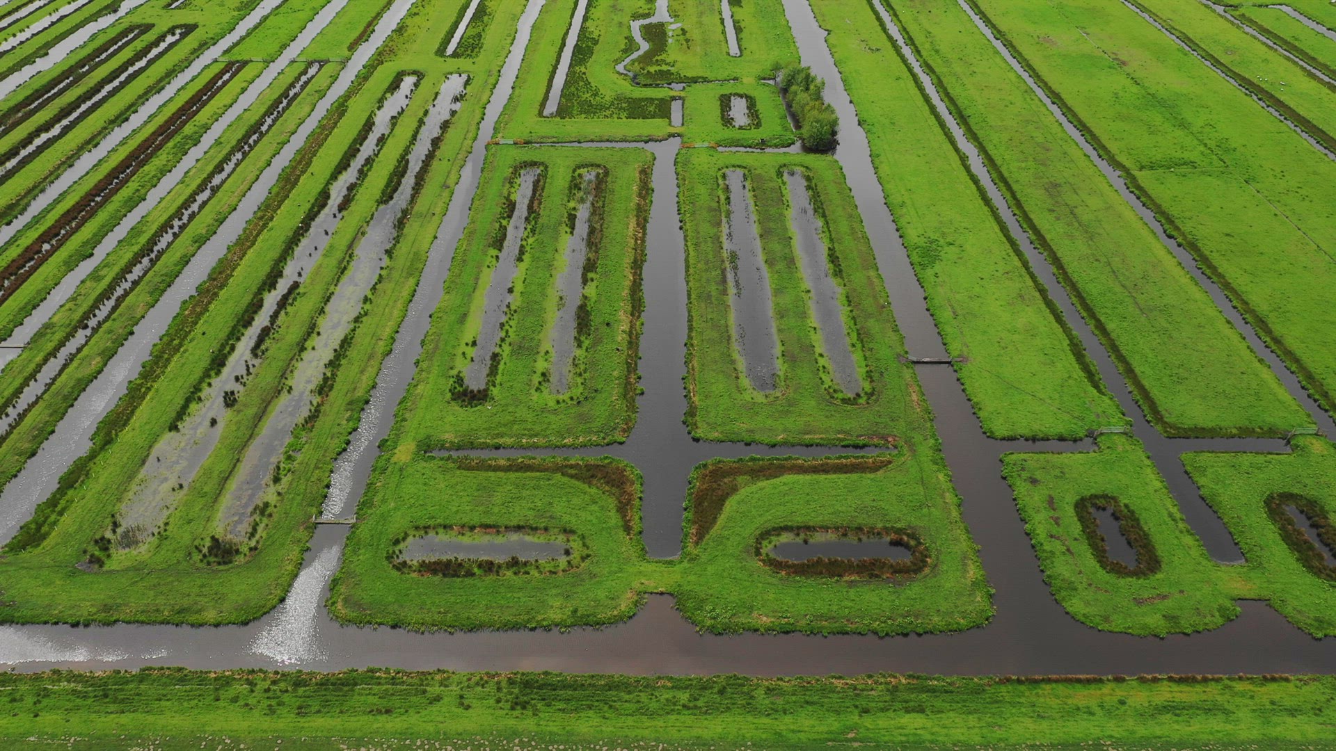 Camera in a helicopter flies toward farming sprinklers, then up and over to a fields of hay bales. Snow capped mountains in the distance.