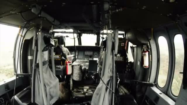 631402 - WS AERIAL TS View of helicopter moving above tree farm landscape while cargo train moving on railway