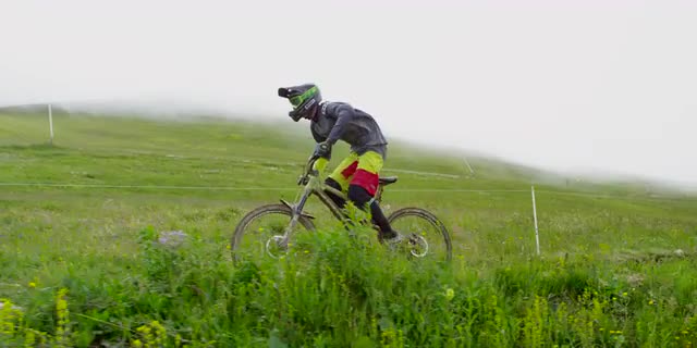 Mountain Biker going fast in the middle of the mountain. Shot with RED Epic.
