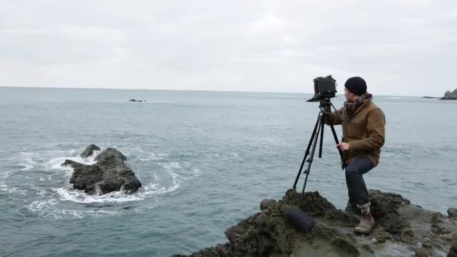 Slow motion of a man walking on rocky coast terrain.