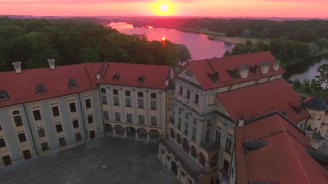 705346 - Aerial View. Flying over the castle's old town at sunset with sun rays. 4K