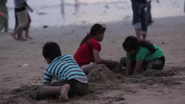 Children play behind the counter at the outdoor market in Mumbai, India.