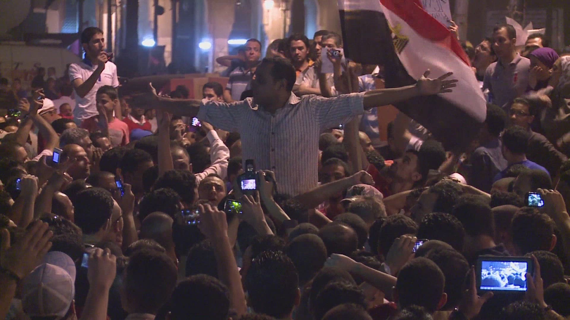 > Protestors wave the Egyptian flag in Cairo, Egypt at a large rally.