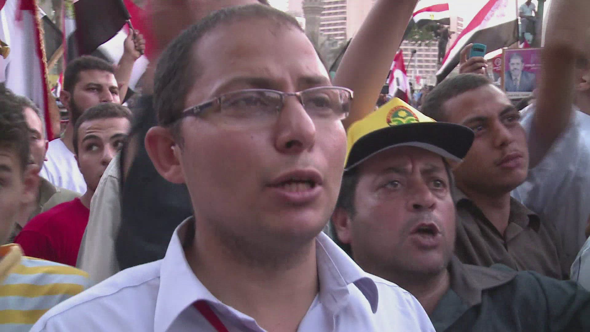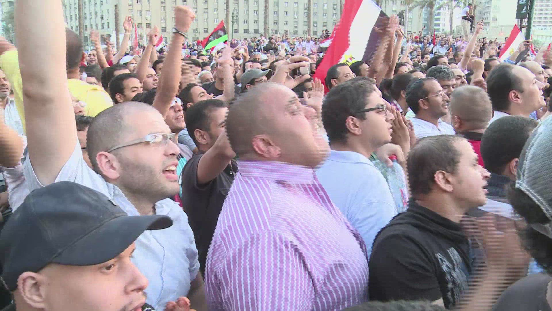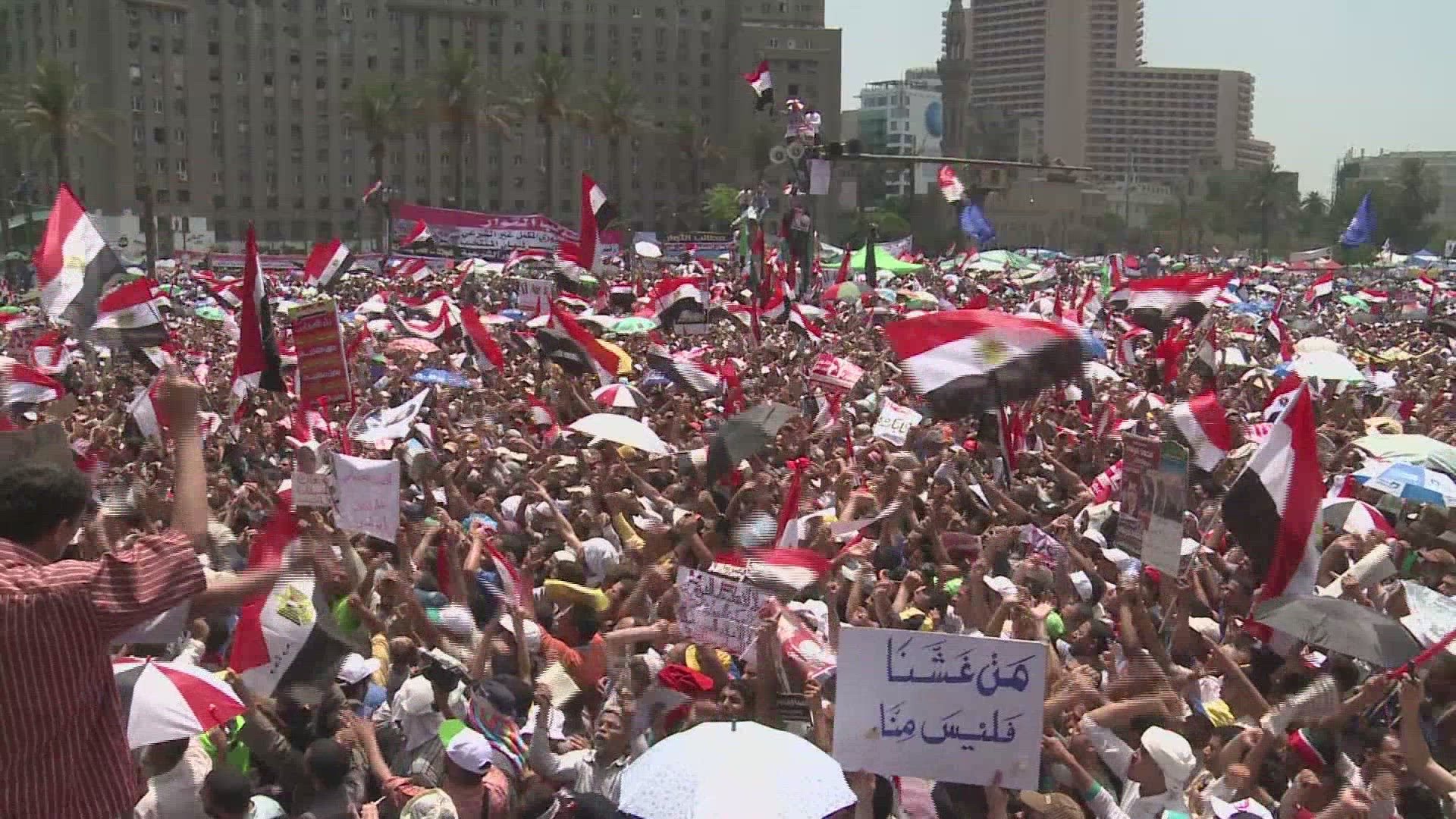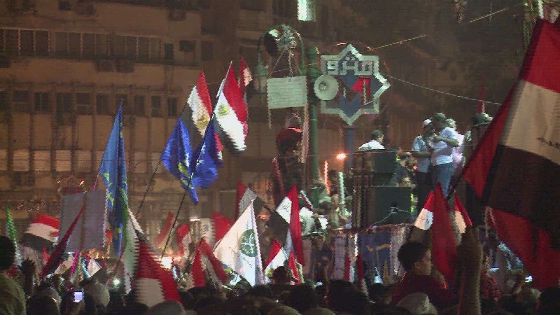 > View overlooking an enormous nighttime rally in Tahrir Square in Cairo, Egypt.