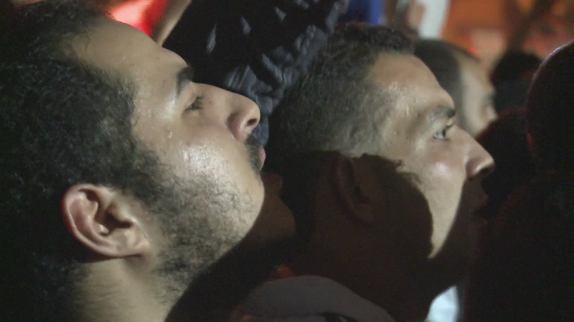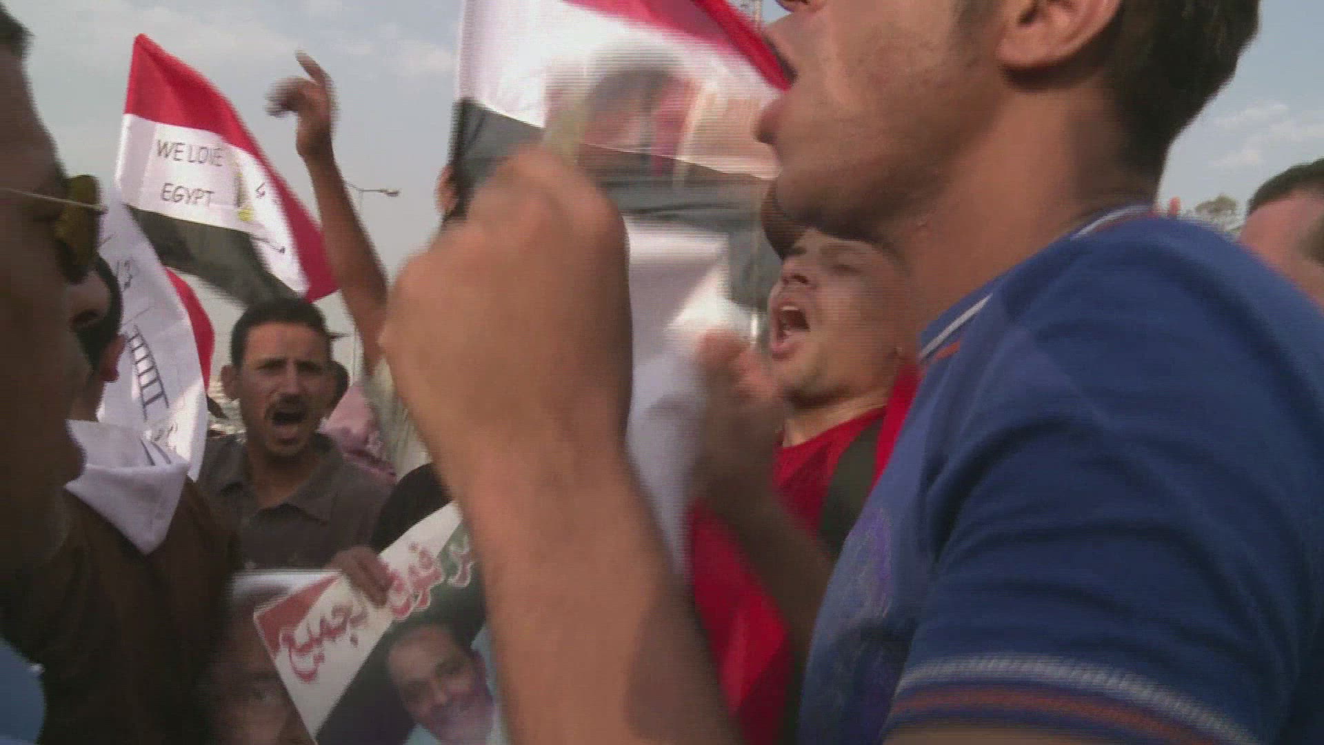 View overlooking an enormous nighttime rally in Tahrir Square in Cairo, Egypt.