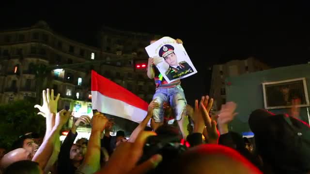 A protestor is hoisted on the shoulders of others during a night demonstration in Cairo, Egypt.