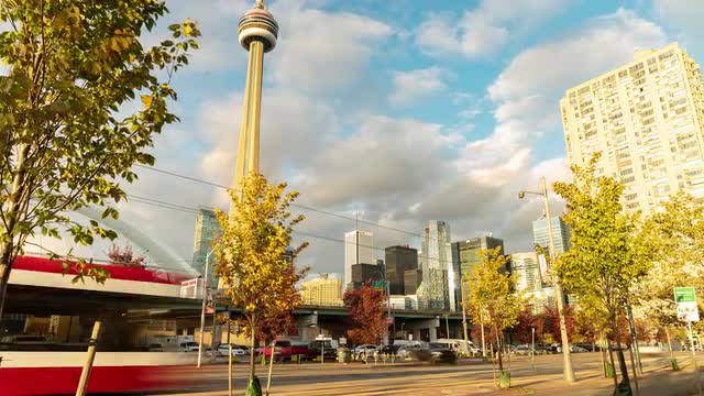 1116653 - Toronto, Canada, Timelapse - The CN Tower as seen from the Harbour Front at Fall