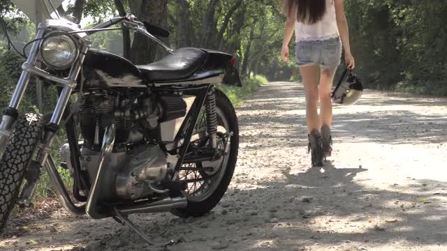 320383 - Girl walking from vintage Triumph