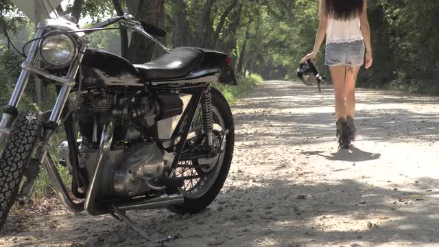 320386 - Girl walking from vintage Triumph