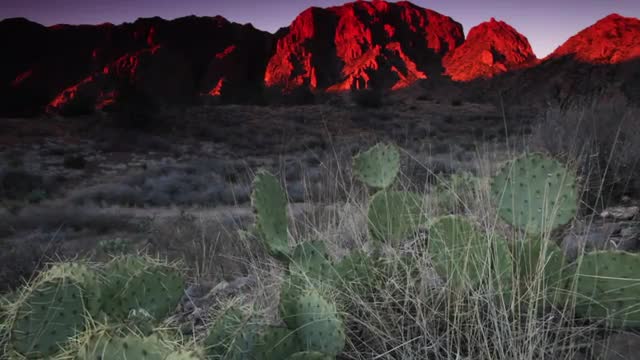 784123 - Sunset pan over red cliff buttes, cactus and desert meadows, wide low angle