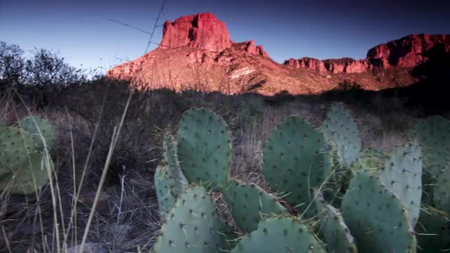 784122 - Sunset pan over red cliff buttes, cactus and desert meadows, wide low angle