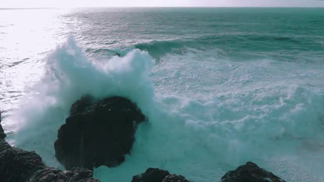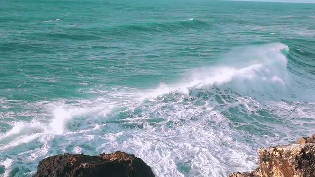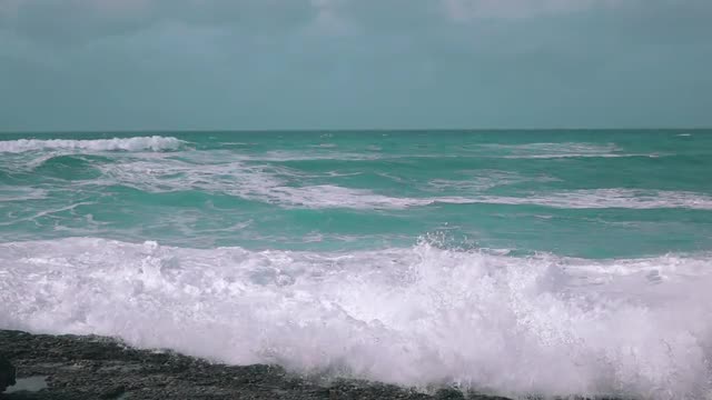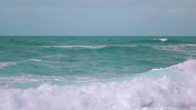 Big waves roll in after a storm on the ocean.