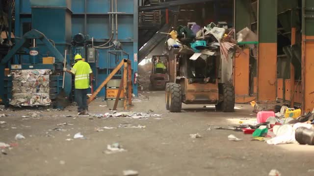 > A skip loader moves pallets of recycled materials in a factory.