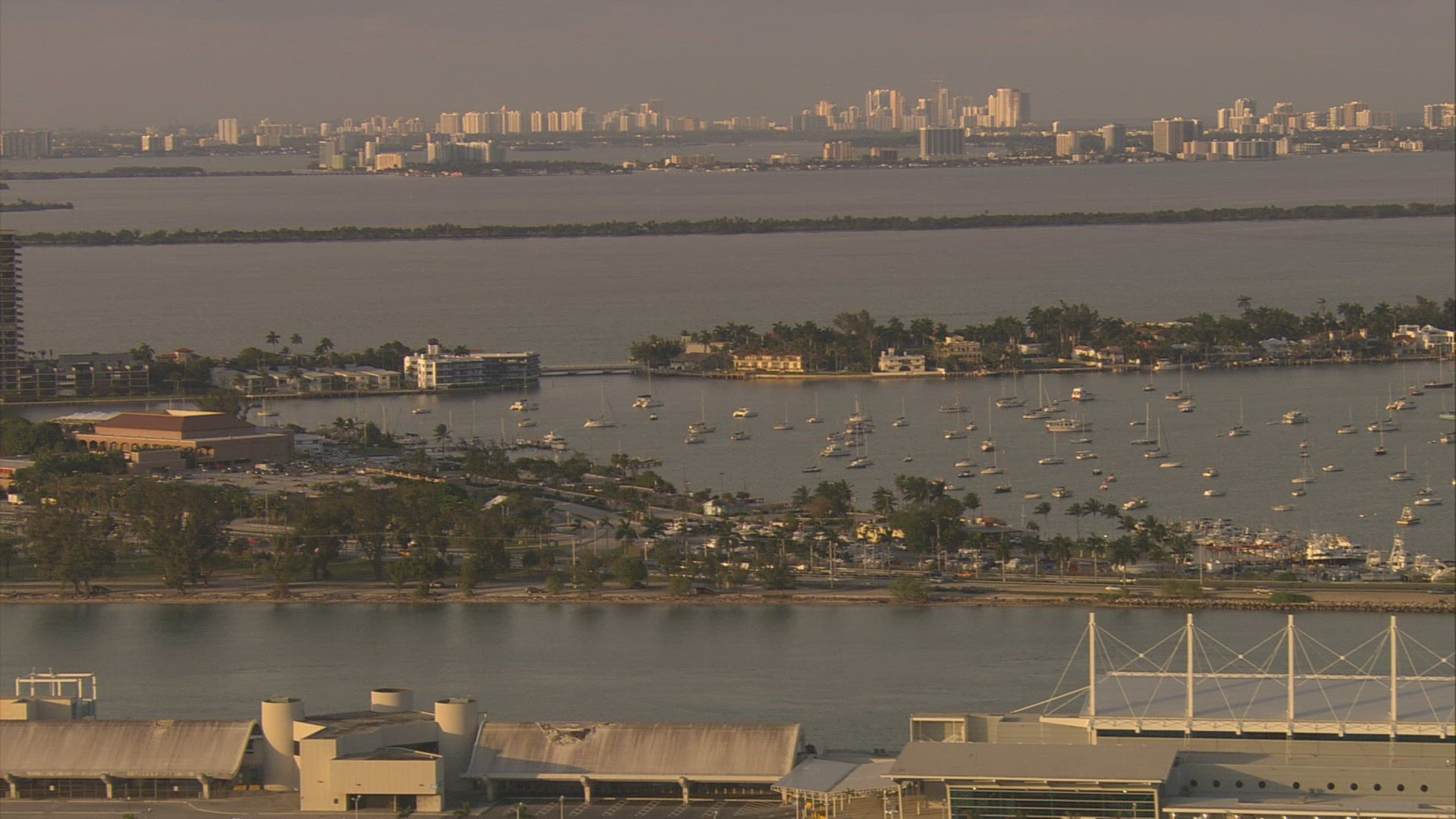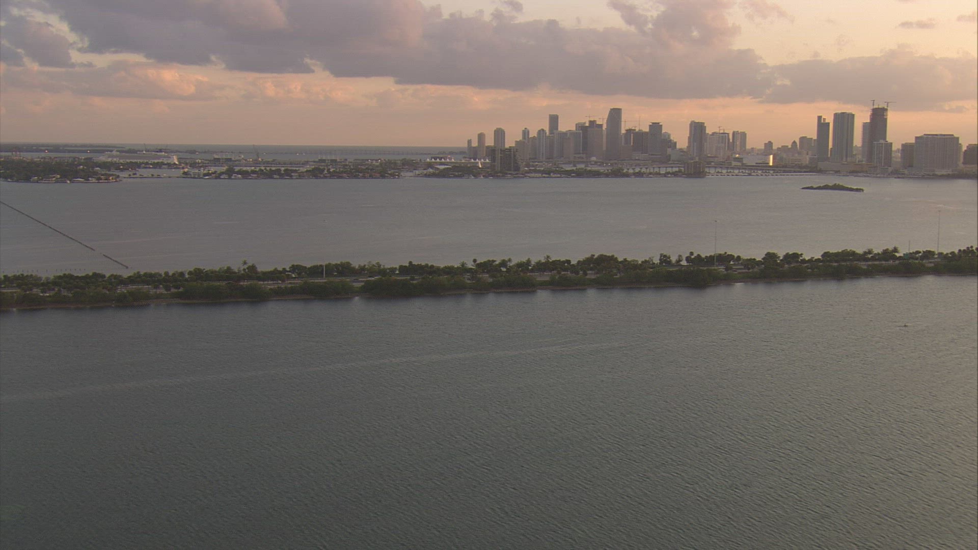 > Wide shot Miami Florida high rise apartments from the POV from a cruise ship.