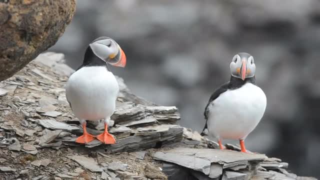 A pair of Atlantic Puffins during a courtship dance on in Krossfjorden on Spitsbergen in the Svalbard Archipelago, Norway.