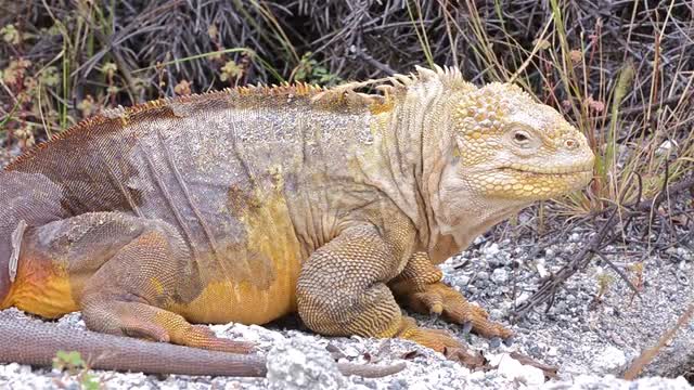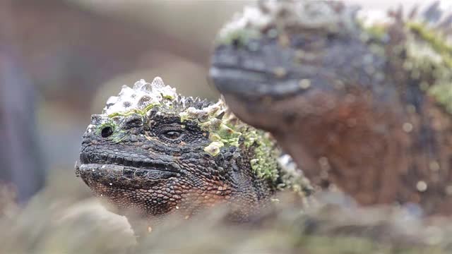 > Close up a lava lizard bolting at Punta Espinoza on Fernandina Island in the Galapagos Islands Natio