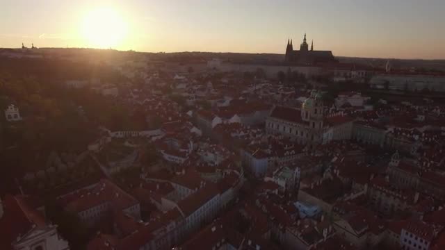 Aerial view of coloured buildings & churches in city of Prague, Czech Republic