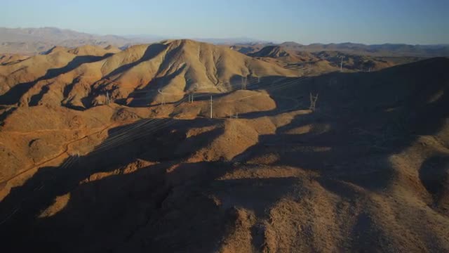 > Aerial view of power lines snaking through mountains near Las Vegas, Nevada.