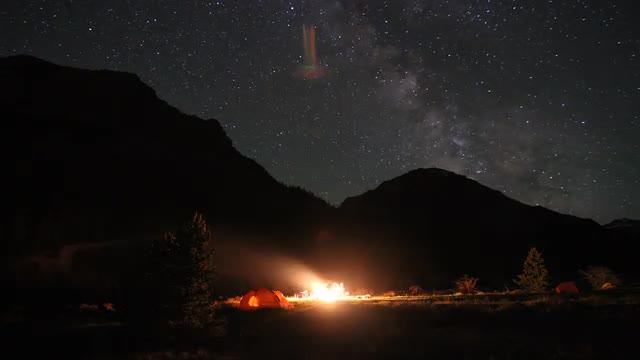 > An extinguished campfire smolders while campers move in the background near a tent.