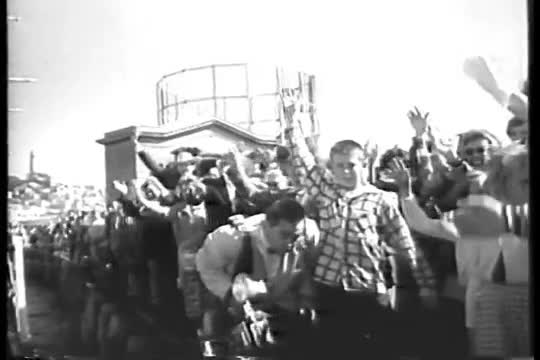 A Chinese ship sails under the Golden Gate Bridge after a voyage from Japan in 1955.