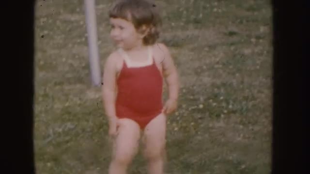 1960s era silent color home movie footage of children playing games at a park and children at a swimming pool.
