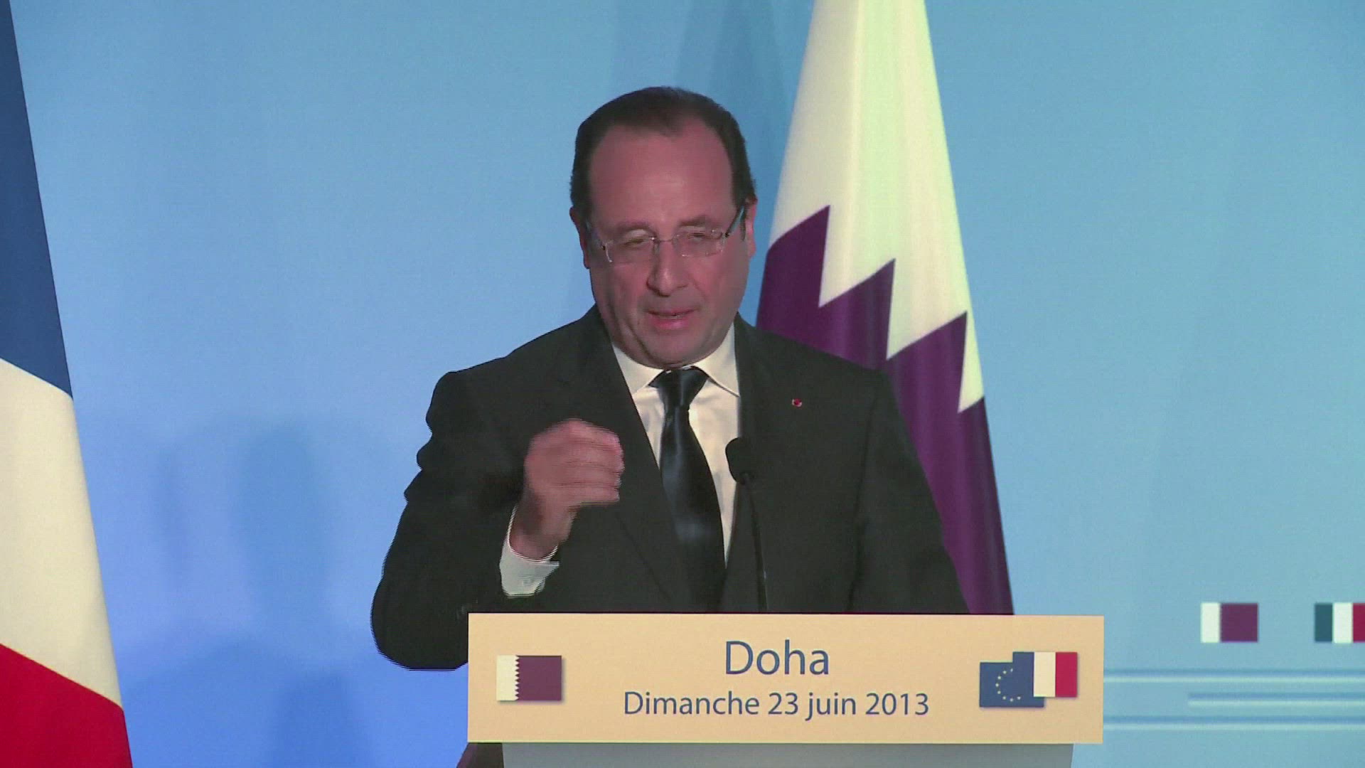 Hollande in Qatar for talks on Syria, economy French President Francois Hollande arrived in Qatar for talks on the Syrian civil war and on economic ties with the gas-rich Gulf state. Images and soundbites.
