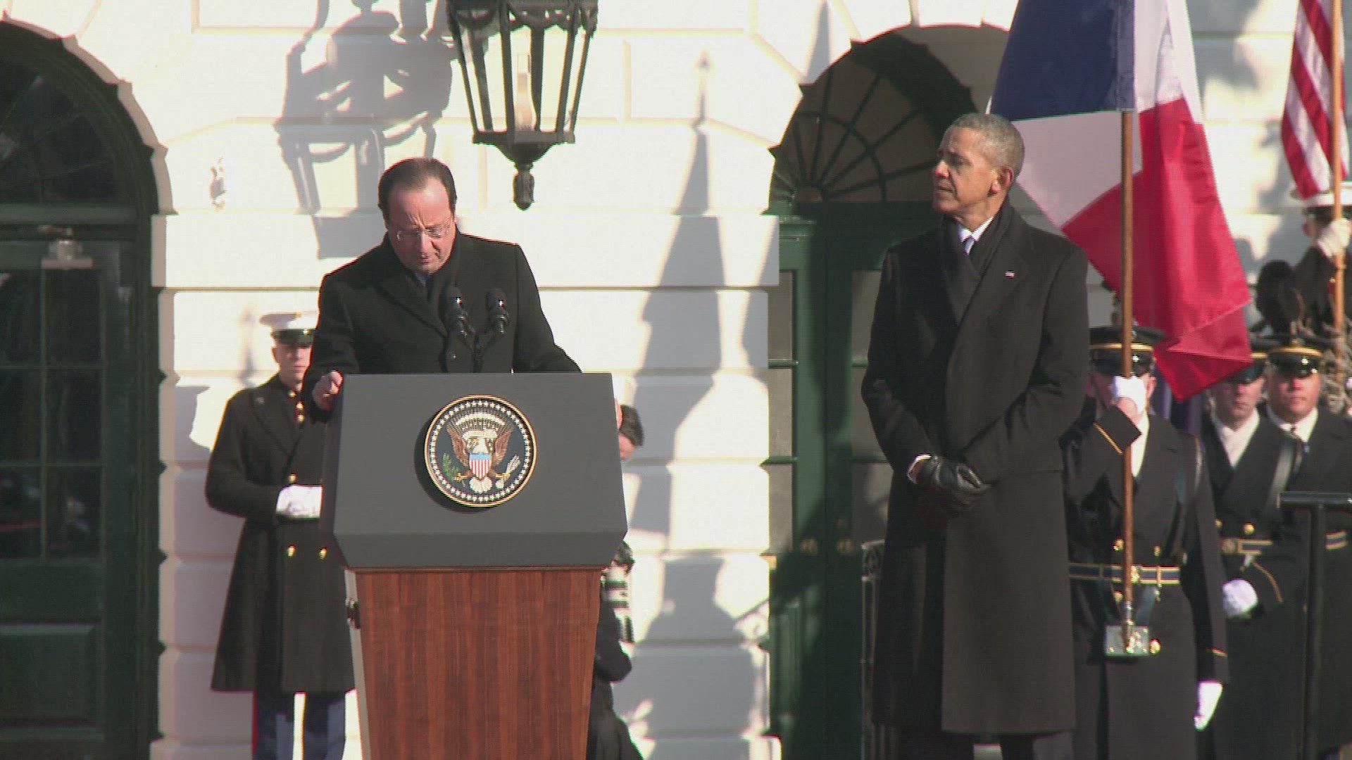 Obama hails French mettle as he welcomes Hollande President Barack Obama on Tuesday praised France as a model ally in a world that must do more to meet common threats, laying on the full flourish of a state visit for President Francois Hollande. Images and soundbites.*ATTN: these are AFPTV imges and soundbites of the arrival ceremony.*