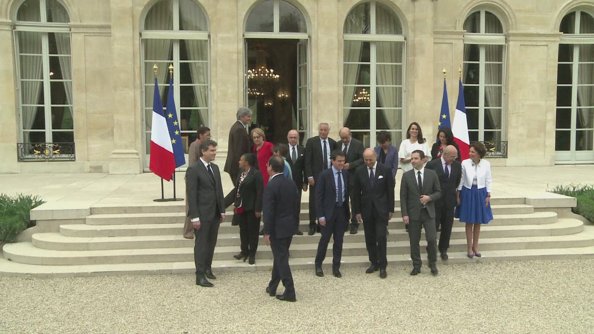 New French Cabinet has first meeting after reshuffle French President Francois Hollande chairs the first meeting of his new cabinet, led by ex-interior minister Manuel Valls. Family photo. IMAGES. (complements VID614115_EN and VID614116_EN)