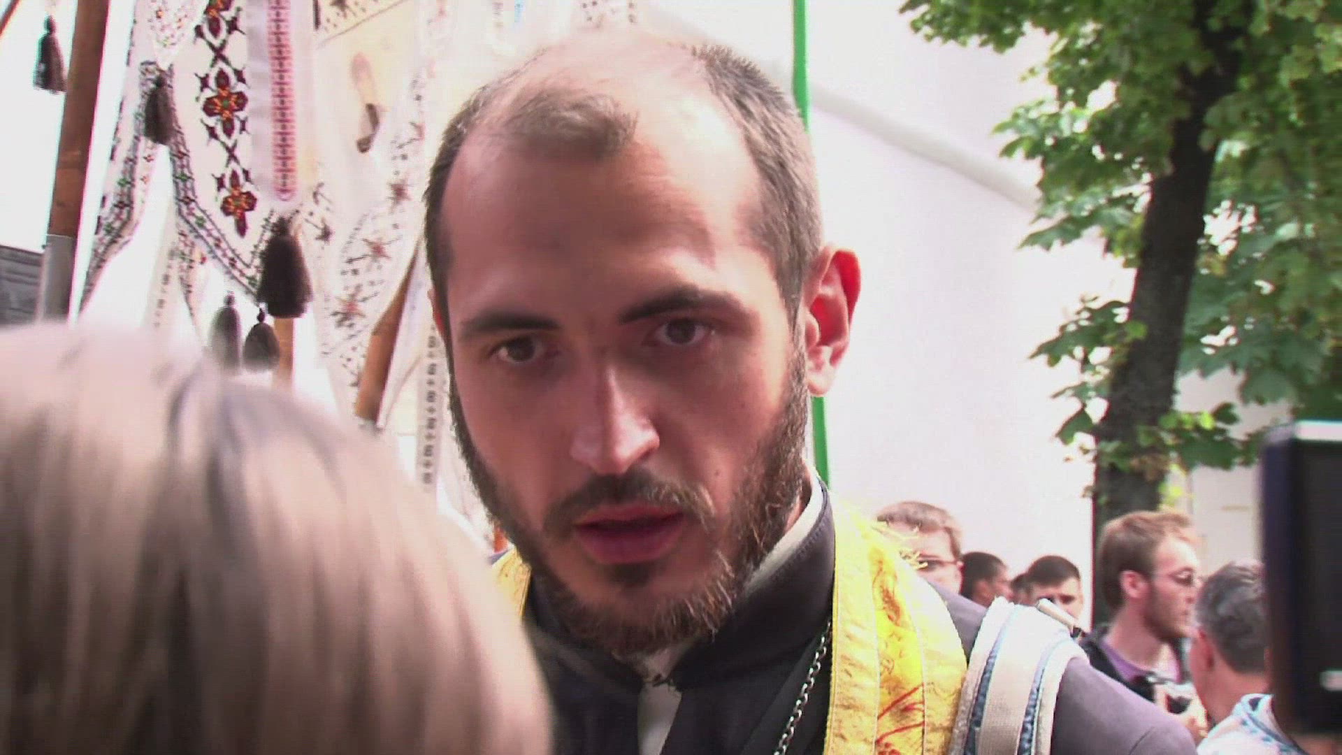 Ukrainian and Russian churches at odds over conflict Scores of pro-Ukrainian militants and a number of Ukrainian Orthodox priests marched on Sunday in protest at what they say is bias towards Russia on the part of Russian Orthodox priests. IMAGES AND SOUNDBITES