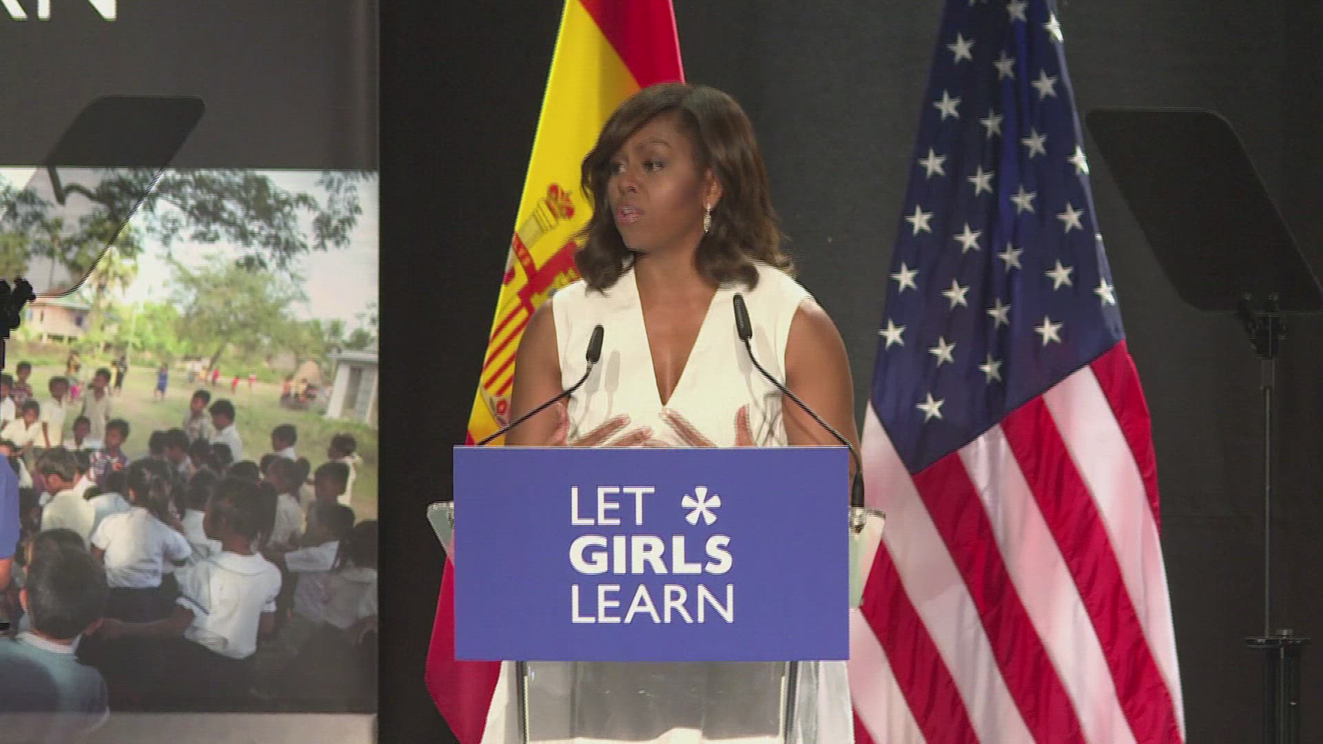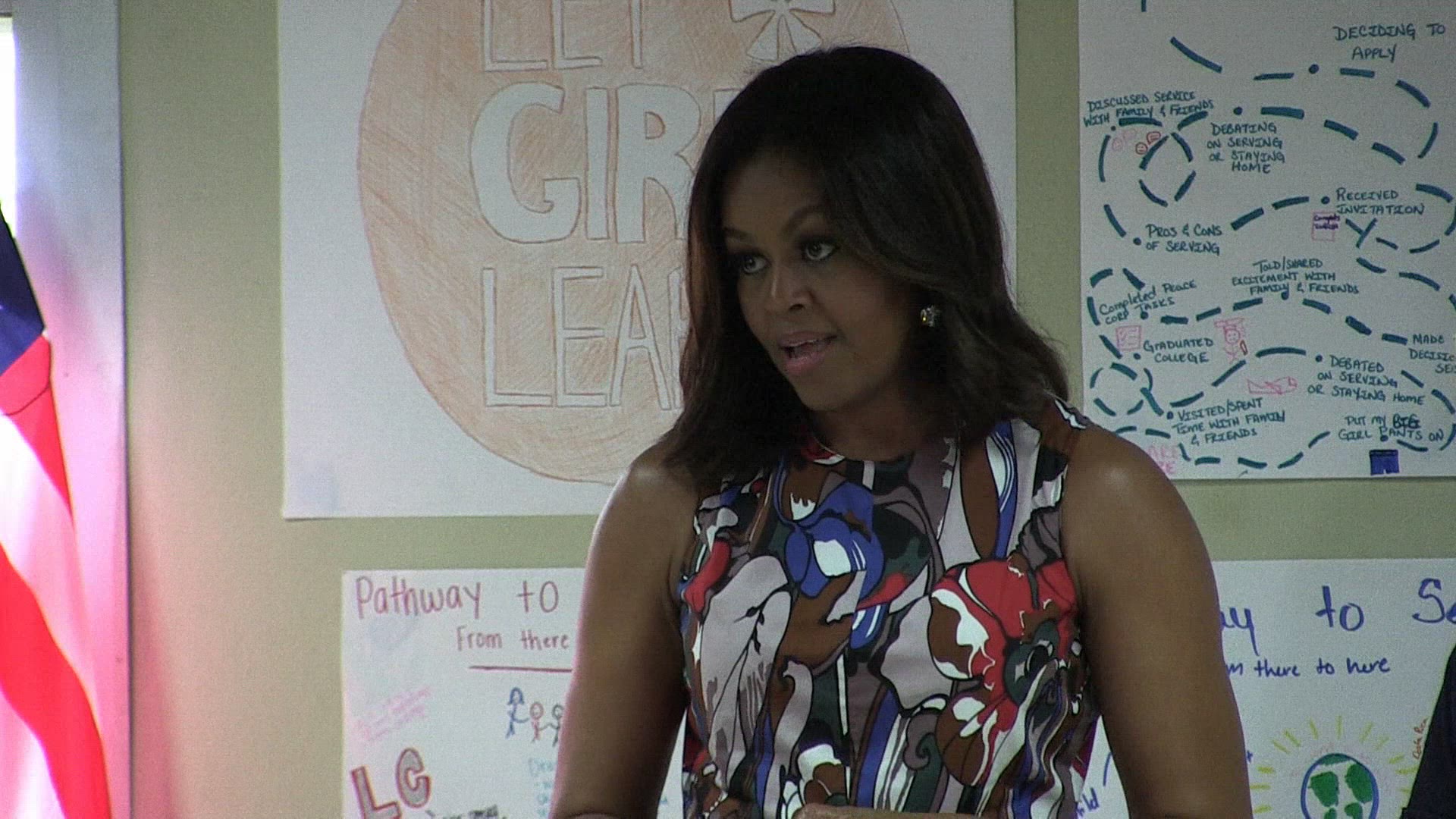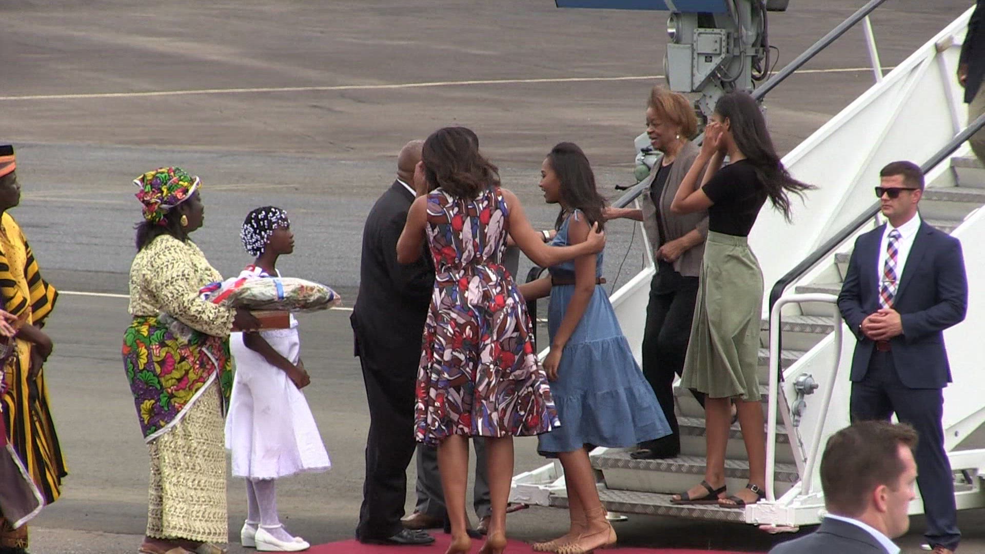 Michelle Obama lands in Morocco US First Lady Michelle Obama lands in Morocco with daughters Malia and Sasha for a two-day visit during which she will join actress Meryl Streep in a conversation with adolescent girls. Obama arrives in Morocco from Liberia, where she encouraged girls to stay in school. IMAGES of Michelle and daughters, Morocco Princess Lalla Salma