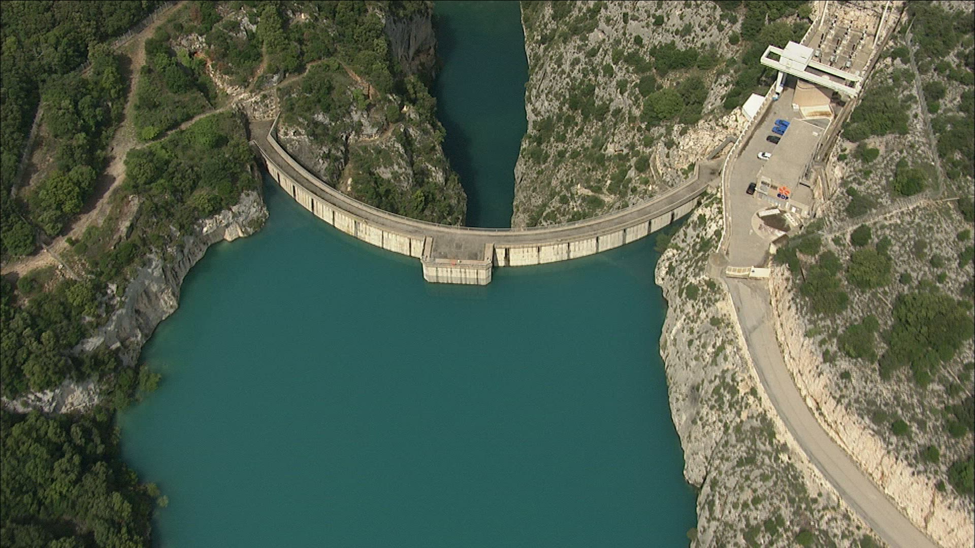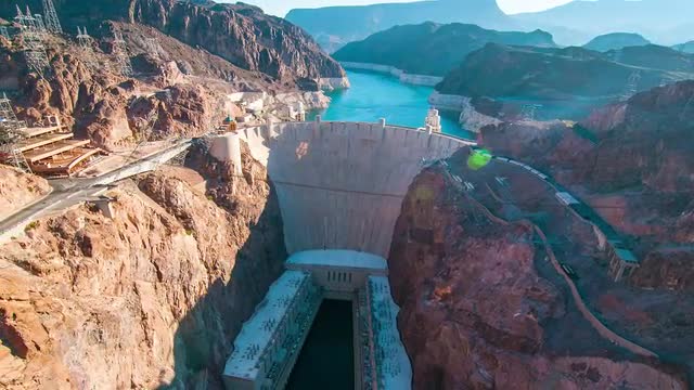 Aerial shot revealing the hoover dam and hoover bridge with Lake Mead in the background.