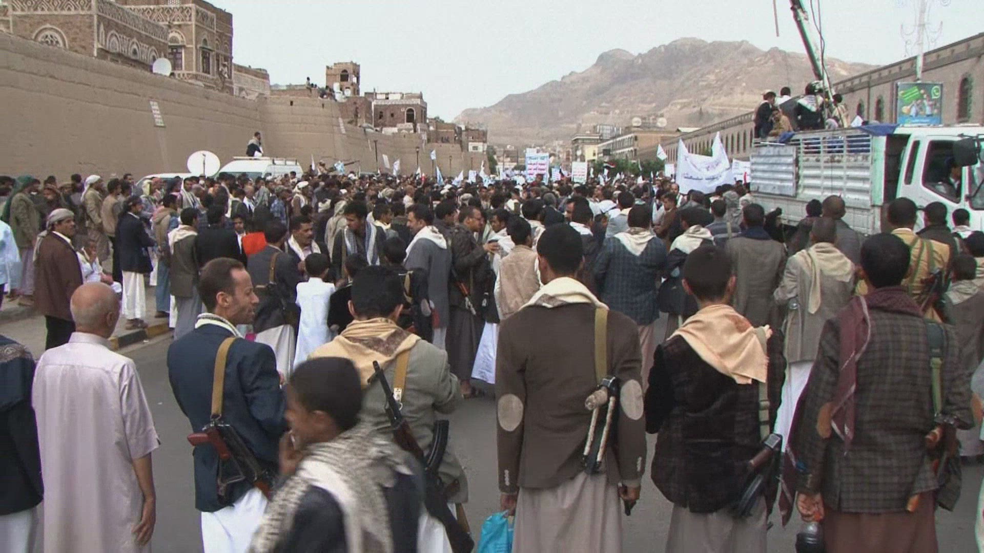 Yemen: Huthi supporters stage anti-US demo in Sanaa On Monday, thousands of supporters of the Shiite Huthi rebels took to the streets of Yemen's capital Sanaa, which is still in rebel hands, to protest against what they say is the US 's undermining of the peace transition process in the country. IMAGES AND SOUNDBITES