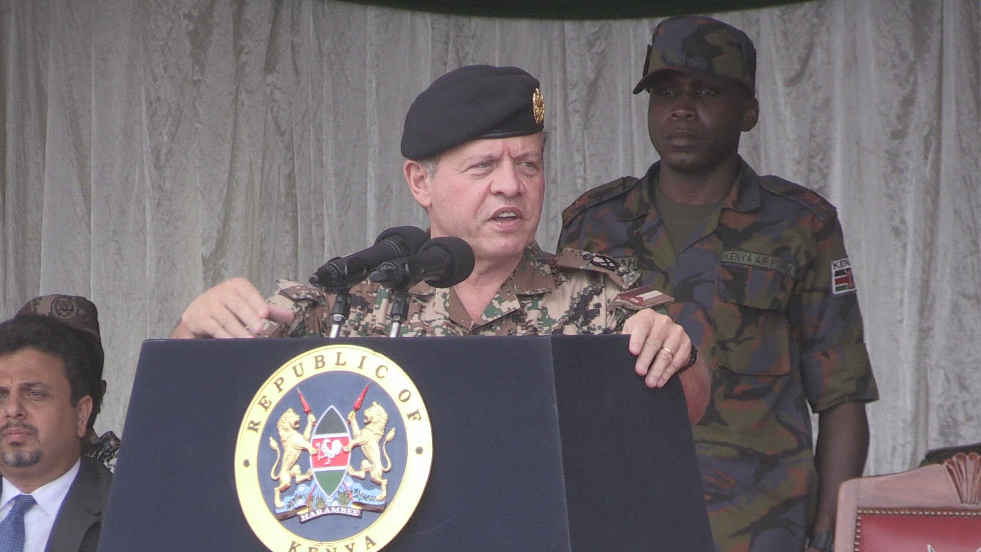 King of Jordan watches joint army exercise on Kenya visit Kenyan and Jordanian soldiers take part in a joint military exercise in Nairobi with Jordan's King Abdullah and Kenya's President Uhuru Kenyatta looking on. IMAGES AND SOUNDBITES