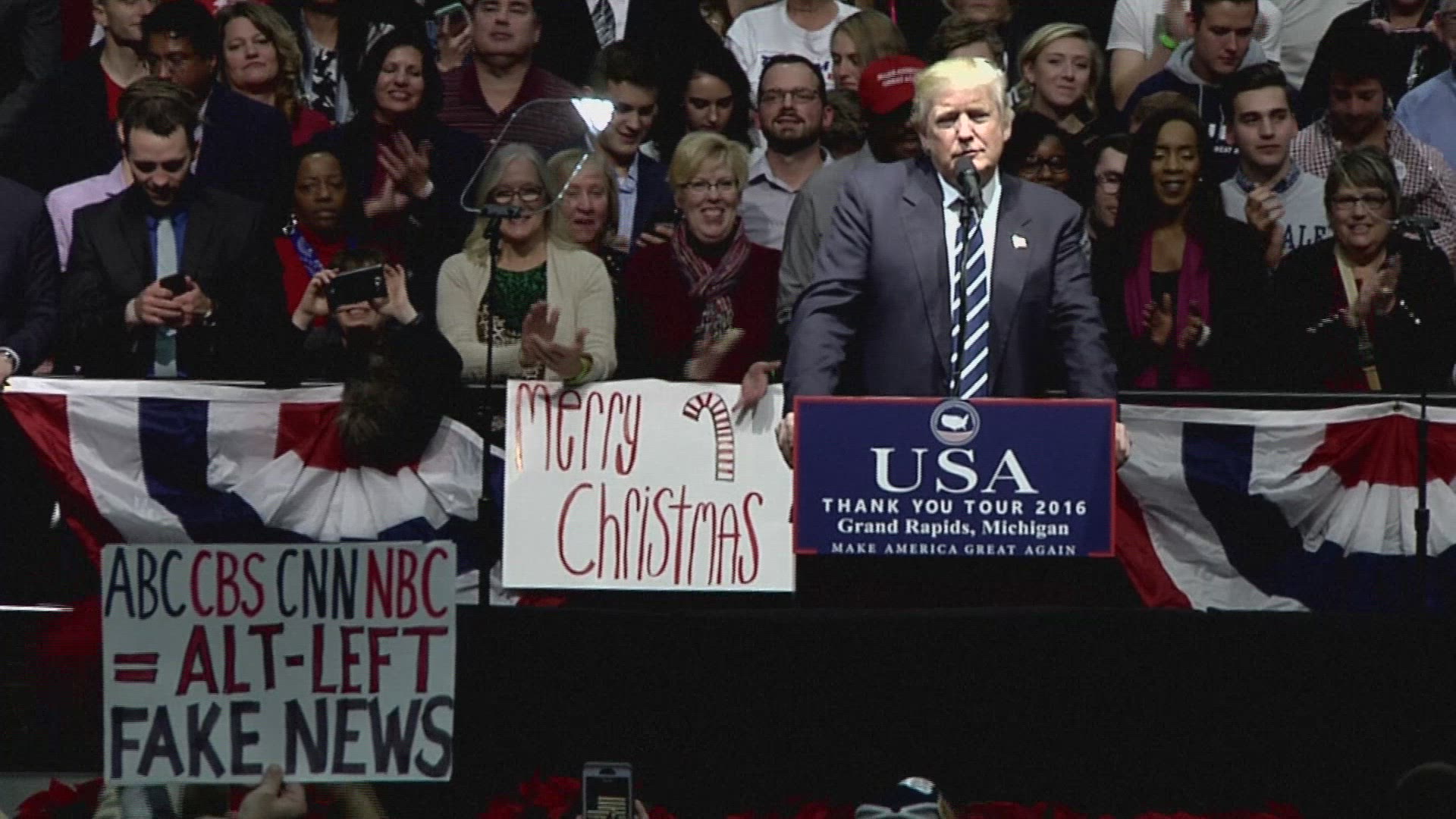 Donald Trump promises jobs at raucous rally in Michigan Donald Trump's victory tour arrives in Grand Rapids, Michigan, where the president-elect says his administration will focus on job creation and he hints at a at a deal with Ford to keep more jobs from going to Mexico. IMAGES AND SOUNDBITES