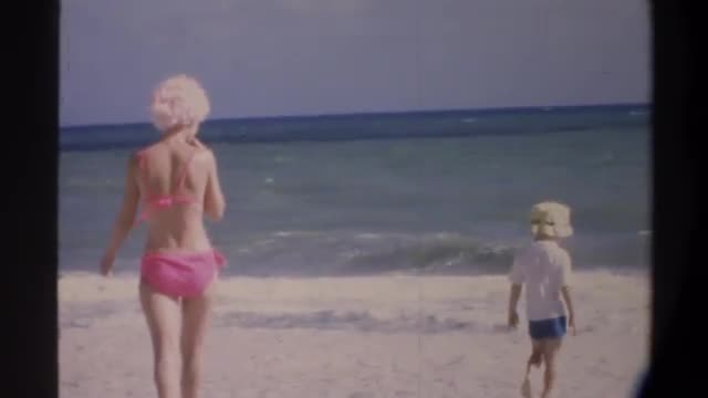 671507 - 1974: blonde in pink bikini strolls on a beach with her kid FLORIDA