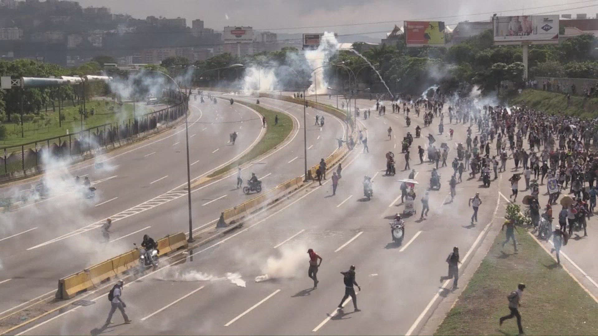 Clashes as Venezuelans protest in political crisis Protesters clashed with police in Venezuela Tuesday as the opposition mobilized against moves to tighten President Nicolas Maduro's grip on power. IMAGES(COMPLETES VID1012922_EN)