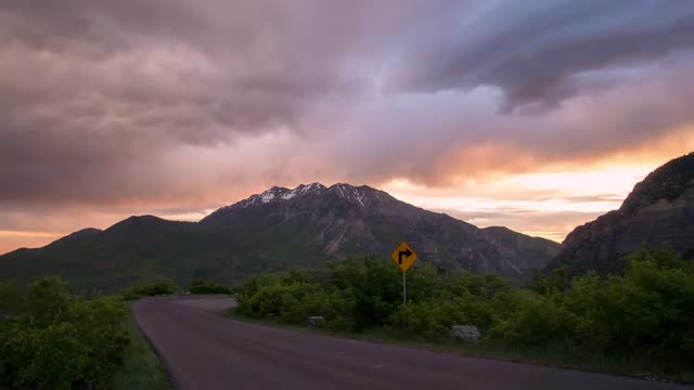 1109058 - Sunrise time lapse looking at mountain and colorful clouds down road