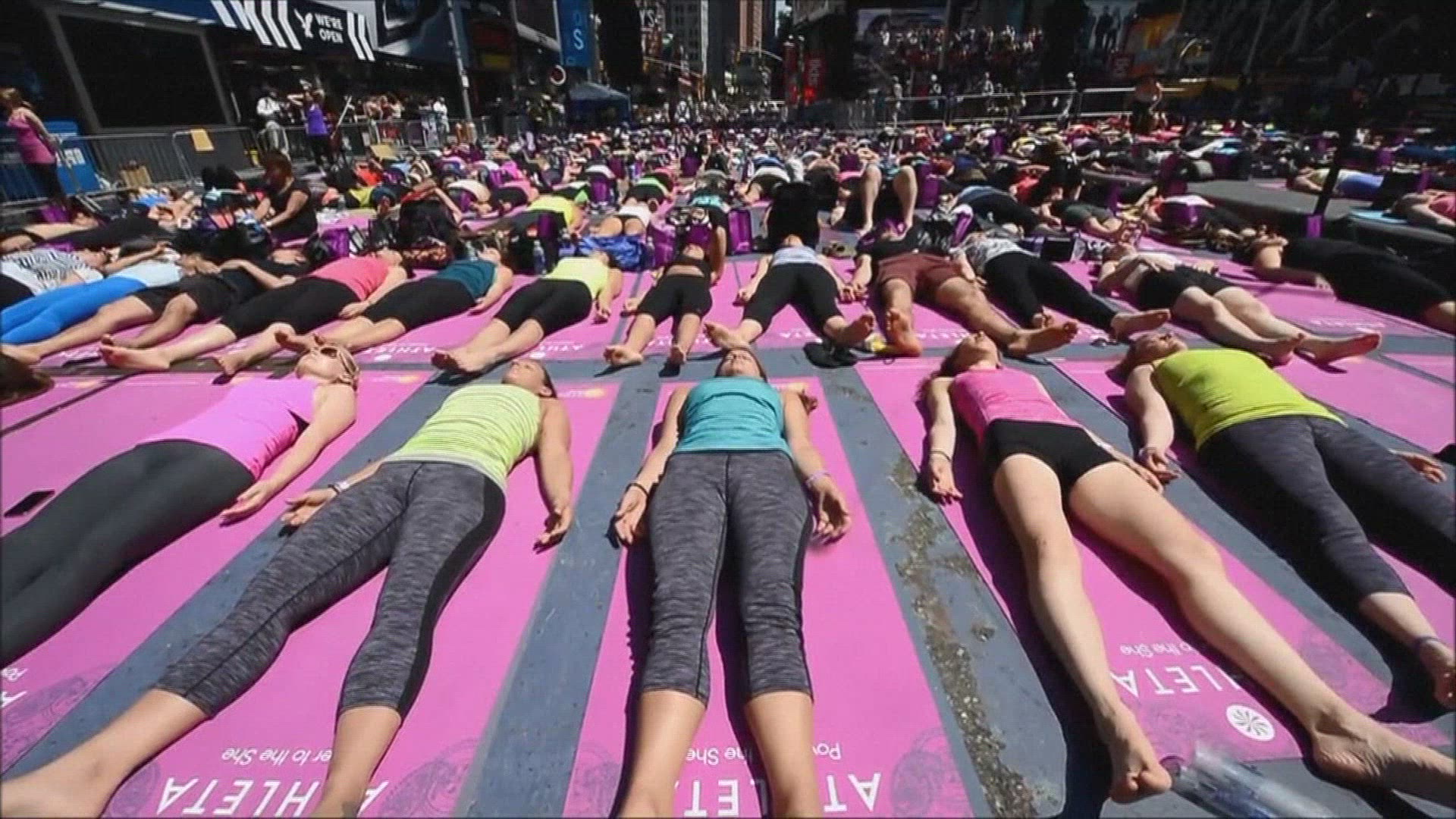 Thousands of yogis search for serenity in Times Square Thousands of yoga aficionados celebrate the summer solstice amid the neon lights and cacophony of Times Square, searching for inner peace in the heart of New York on International Yoga Day. IMAGES AND SOUNDBITES.
