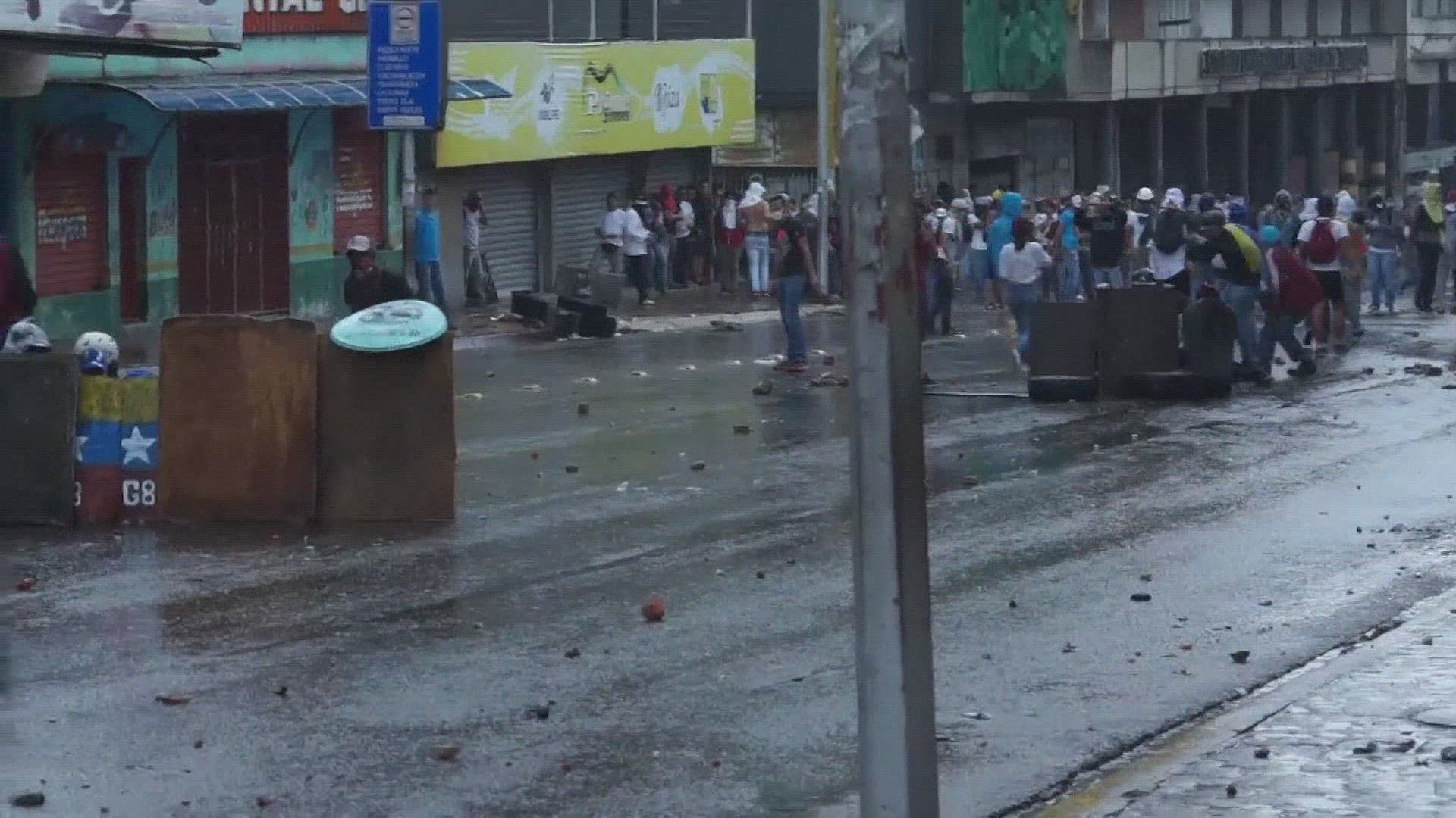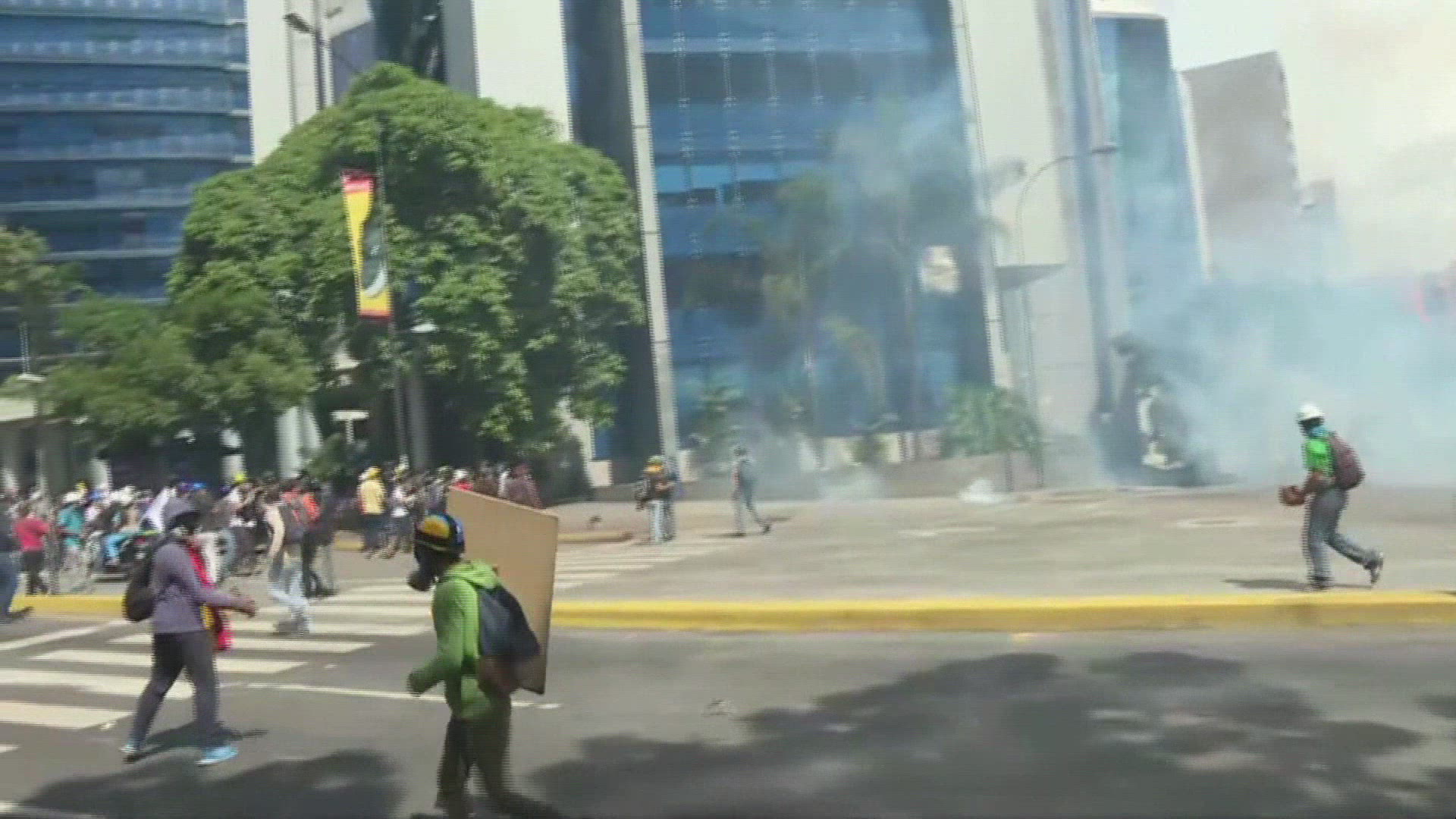 Tear gas vs homemade weapons: clashes continue in Caracas Demonstrators take refuge behind wooden shields and fire explosives with homemade launchers as clashes continue between protesters and security forces, armed with tear gas, on Tuesday in Caracas. IMAGES AND SOUNDBITES
