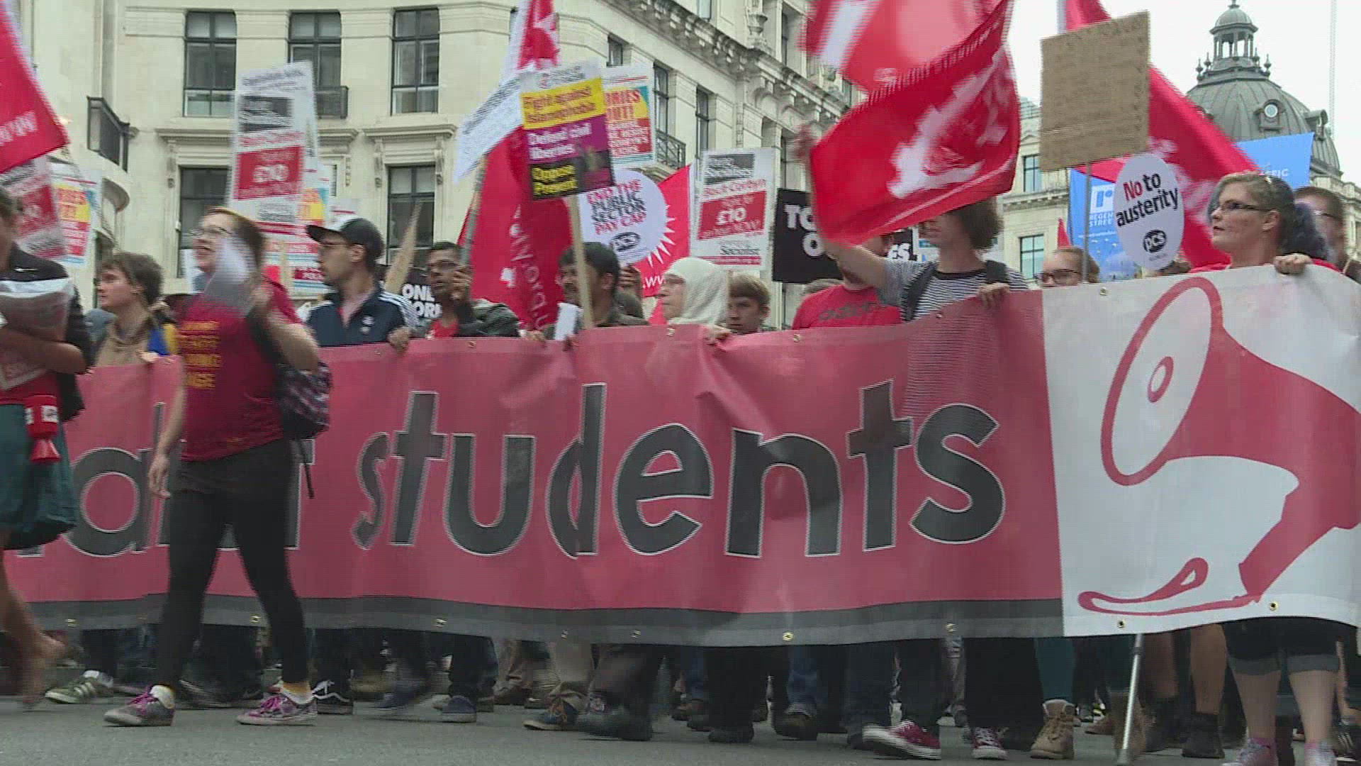 Thousands in anti-govt, anti-austerity march in London Thousands of people march through London protesting against the government led by Prime Minister Theresa May and demanding an end to austerity. IMAGES