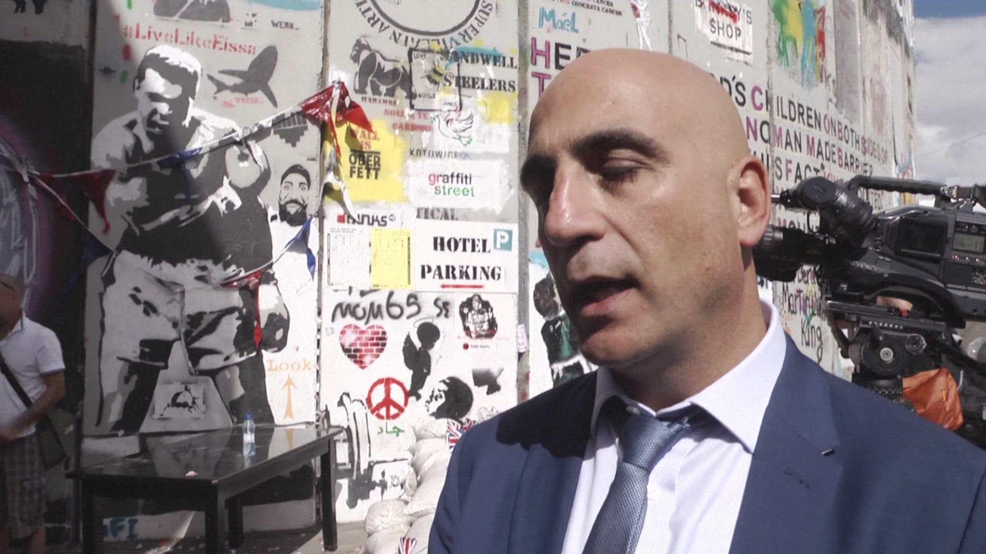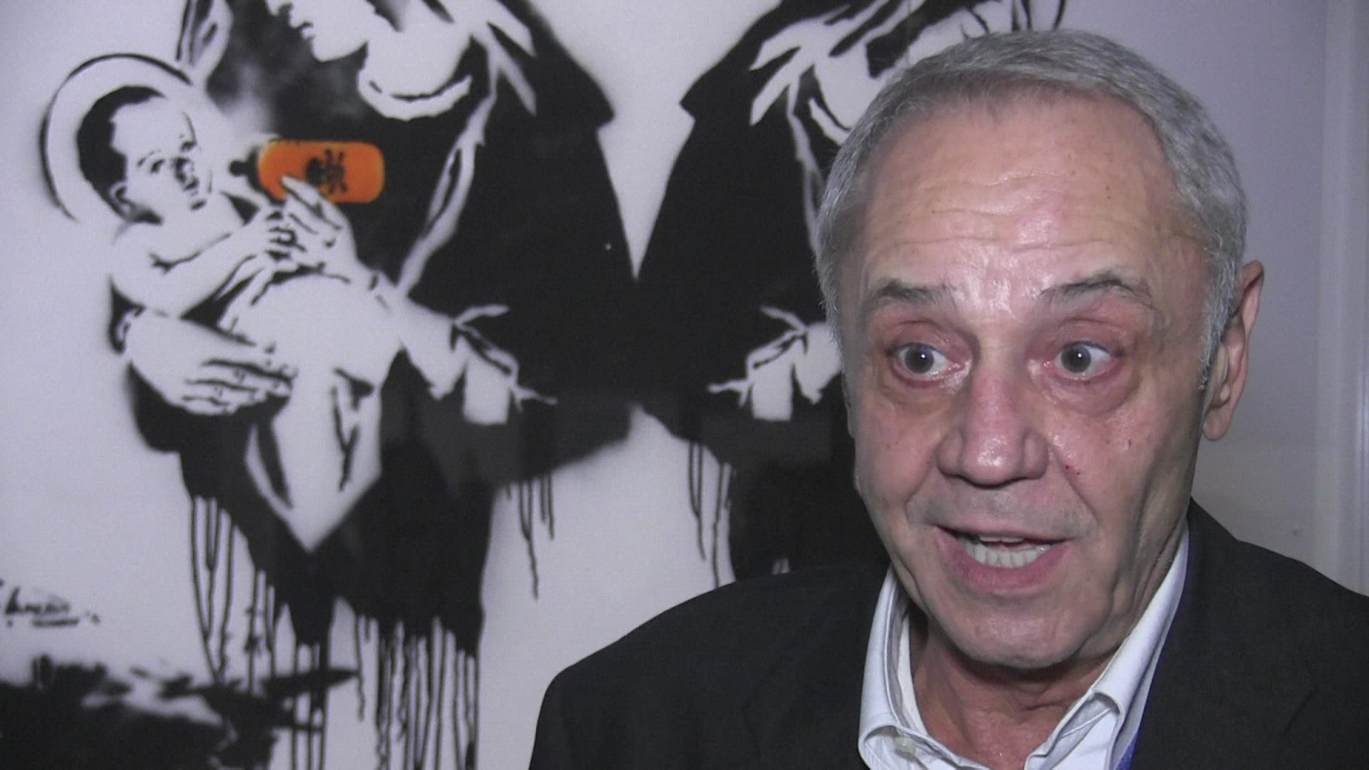 Banksy holds Balfour 'apology party' for Palestinians Secretive British street artist Banksy holds a special event to apologise for the 100th anniversary of the Balfour Declaration outside his hotel in the occupied West Bank.