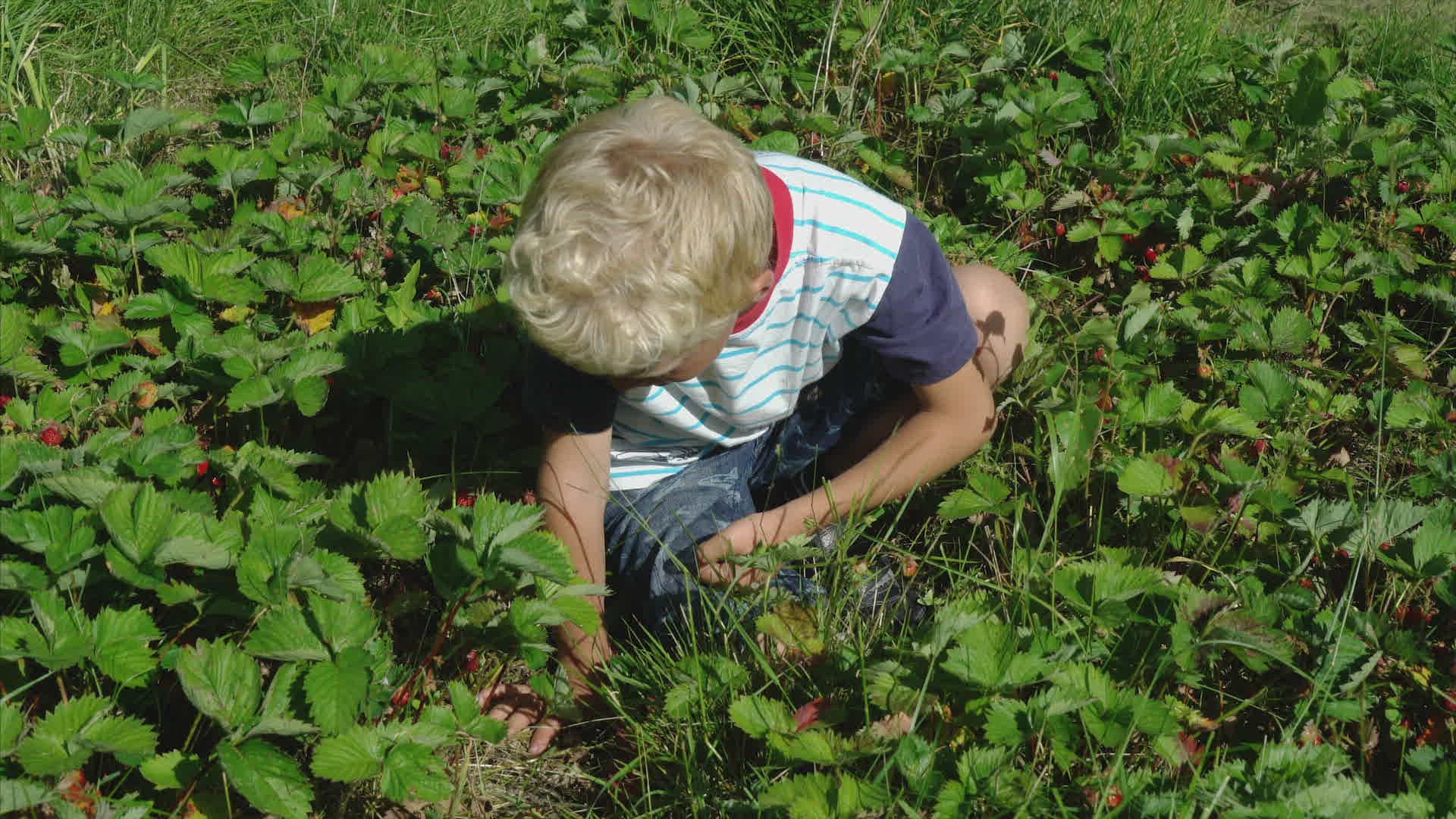 A young boy with a cowboy hat looks into the camera with a blade of grass in his mouth