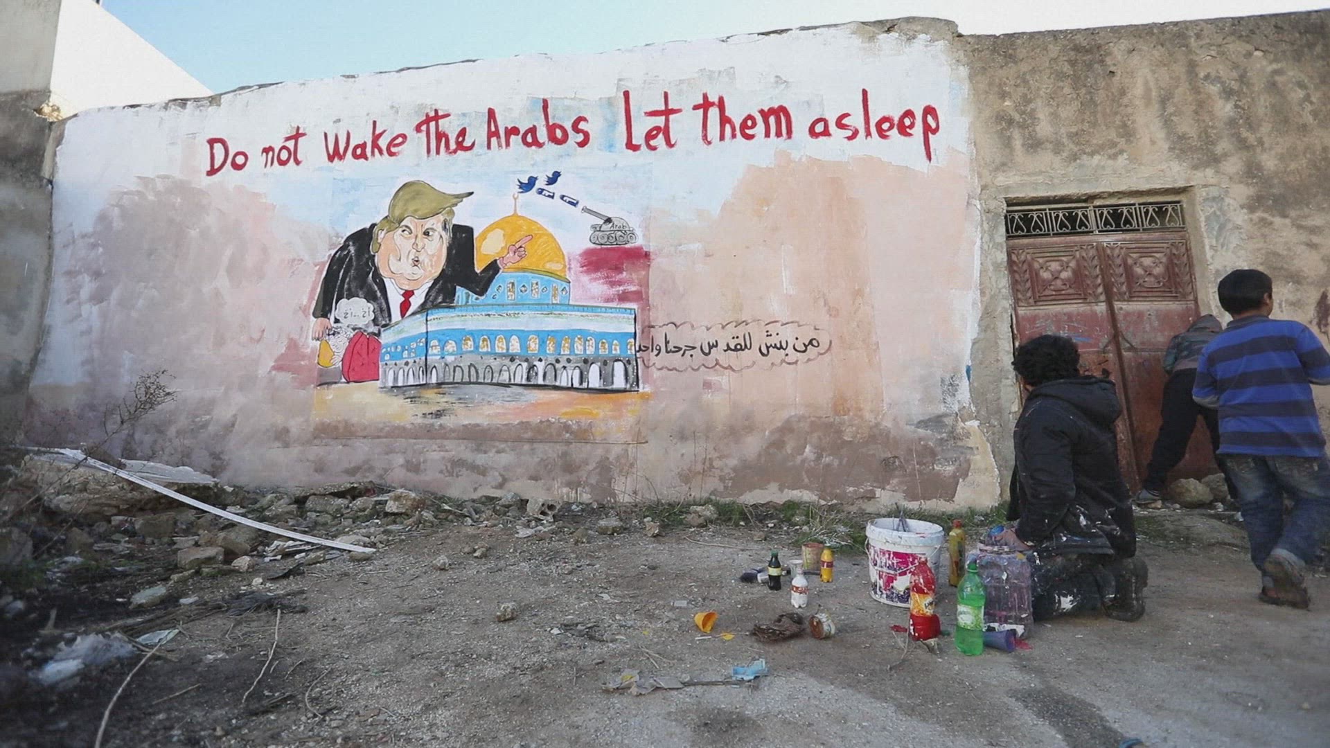 Syrian artist paints mural protesting Trump Jerusalem moves An artist living in Syria's Idlib province painted a mural Thursday protesting US President Donald Trump's recognition of Jerusalem as the Israeli capital. IMAGES AND SOUNDBITE