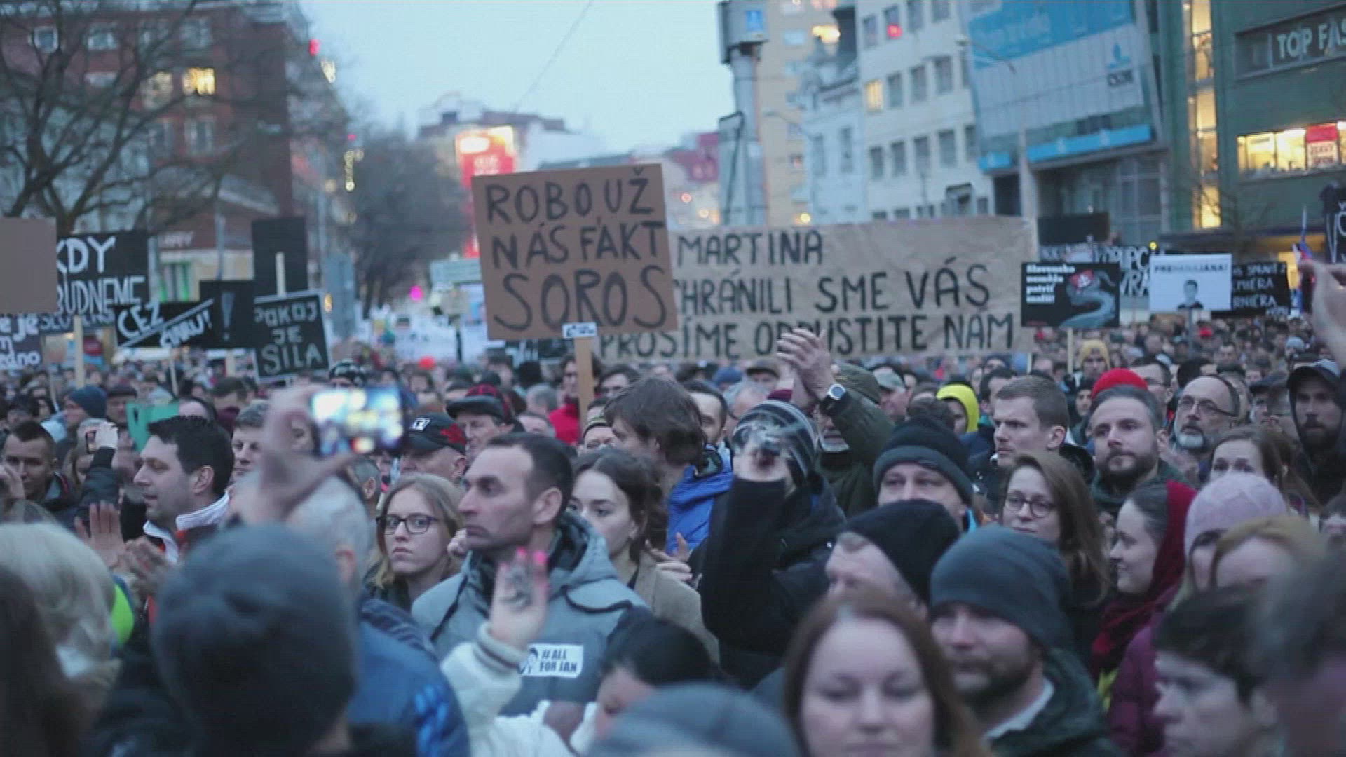 Bratislava: demonstration following murder of journalist (2) Slovakians demonstrate and pay homage to murdered journalist Jan Kuciak in Bratislava who was killed while investigating high-profile tax fraud. IMAGES AND SOUNDBITES / COMPLETES VID1149149_EN