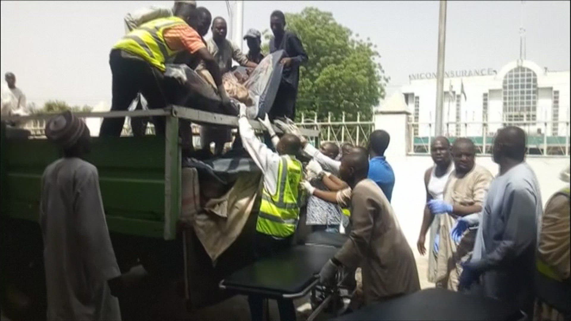 Scenes in Nigeria after suicide blasts kill over sixty Scenes in Mubi, Nigeria, after suicide blasts near a market and mosque kill over sixty people.