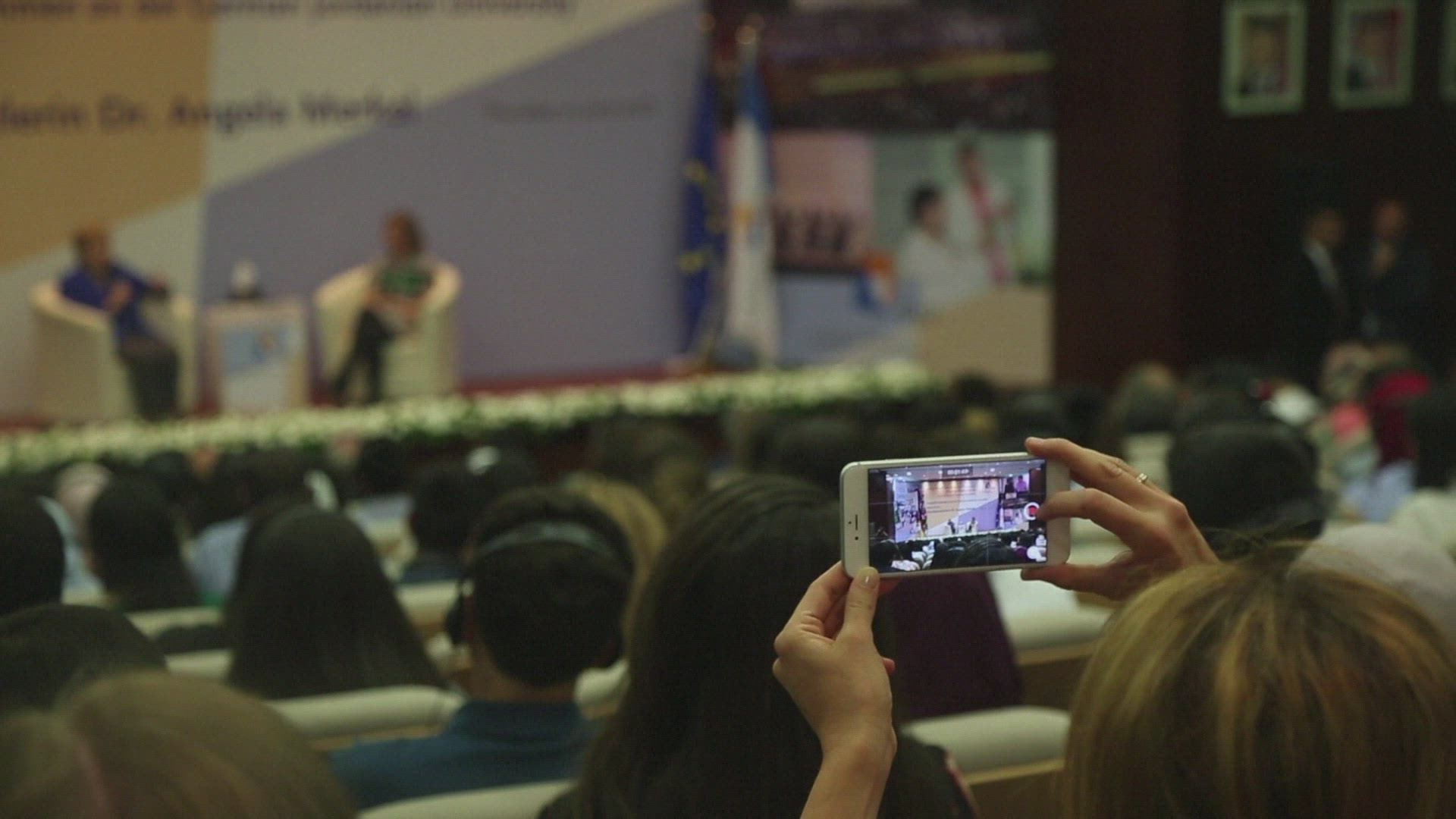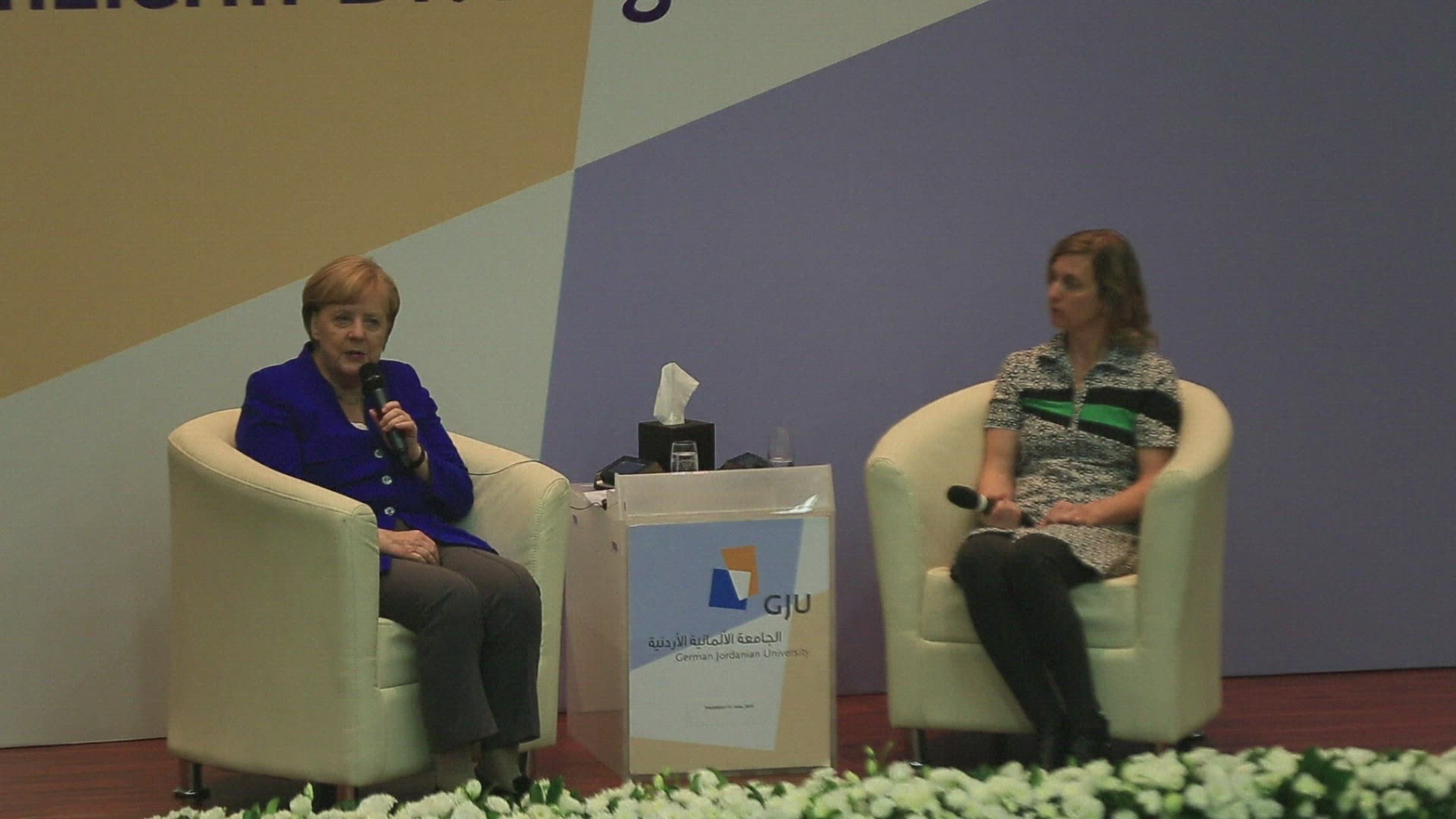 Angela Merkel visits German university in Jordan Angela Merkel speaks to students at the German University of Madaba, in Jordan, and discusses common issues from both countries, such as the refugees crisis. 1ST IMAGES