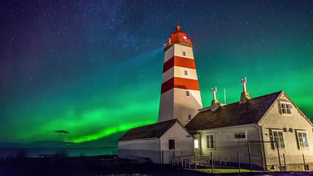 4K UHD Timelapse footage of the northern lights (aurora borealis) above the Lighthouse at Alnes, near the town of Ålesund in Norway.