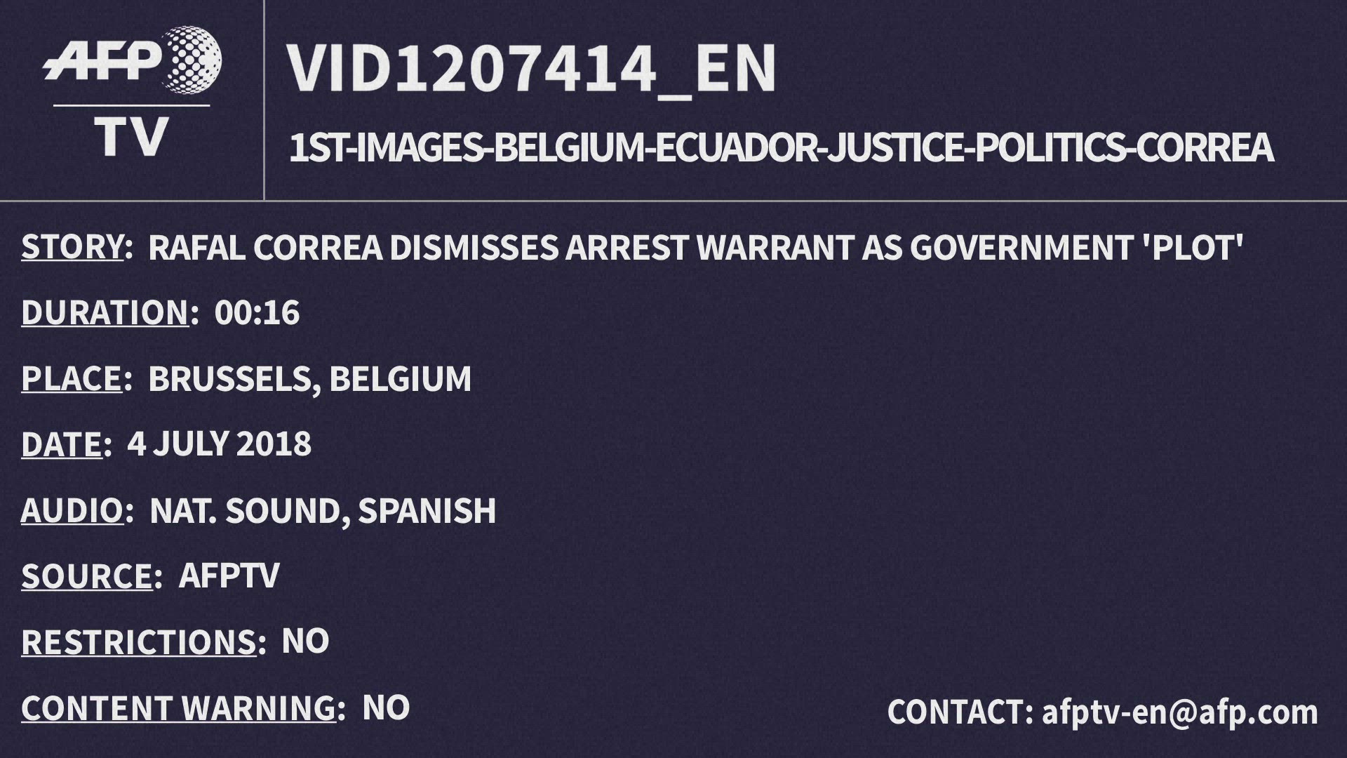 Rafael Correa dismisses arrest warrant as government 'plot' (2) Former Ecuador president Rafael Correa says that an arrest warrant issued by a court in his homeland is part of a "plot" by the government against him, during an interview with AFP in Brusselswhere he is now based.IMAGES AND SOUNDBITES. [Completes VID1207414_EN]